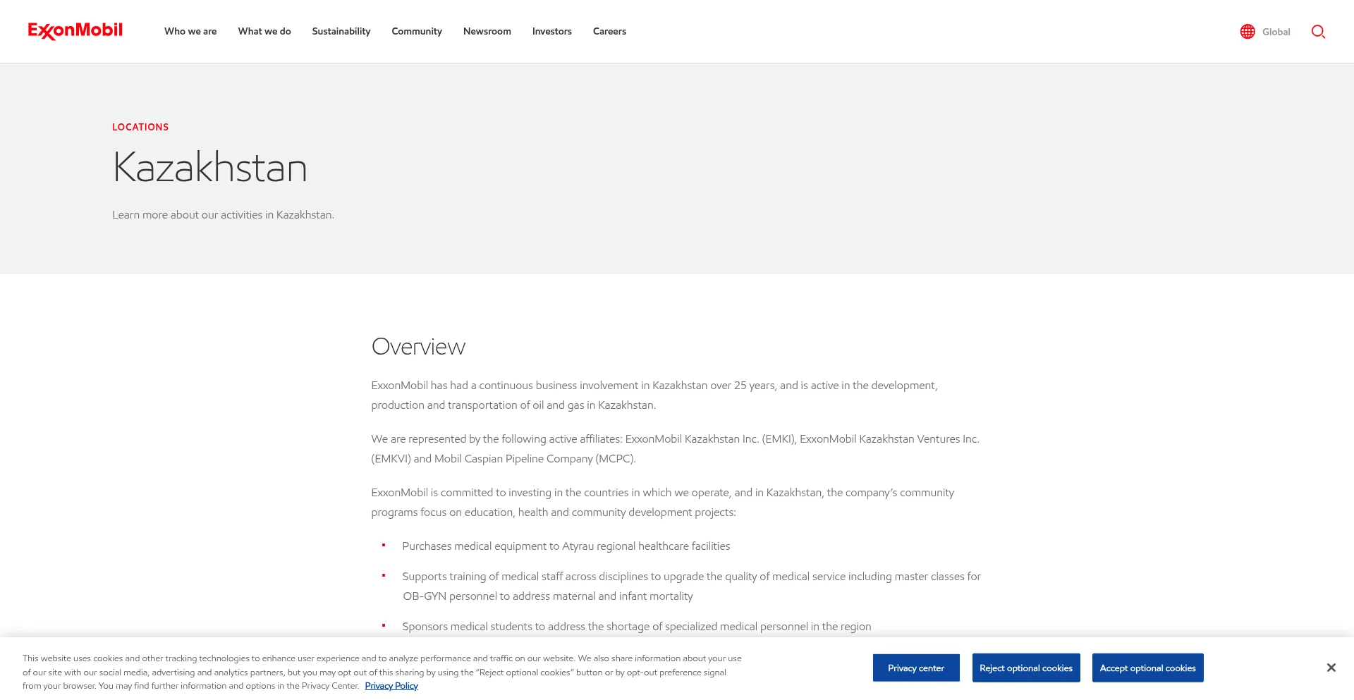 ExxonMobil has had a continuous business involvement in Kazakhstan for 20 years, and is active in the development, production and transportation of oil and gas in Kazakhstan.