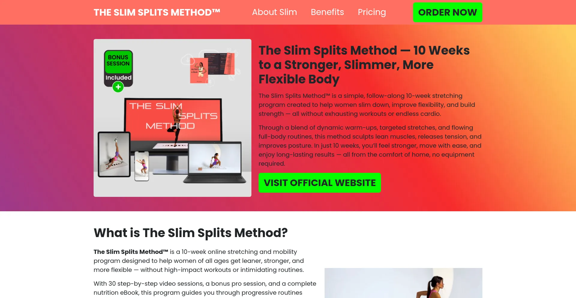 Slim Splits Method™ offers a beginner-friendly routine with daily exercises to help you burn fat, tone muscles, and improve posture efficiently.
