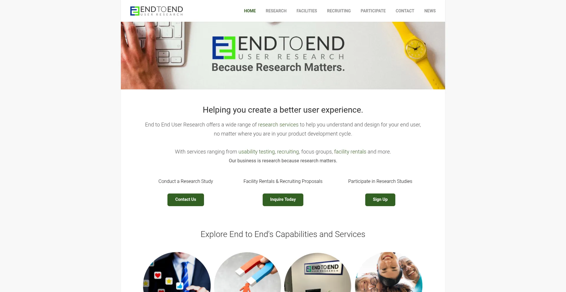 End to End User Research offers UX and usability research consulting. Rent focus group suites, mock trial rooms, and usability labs to conduct studies.