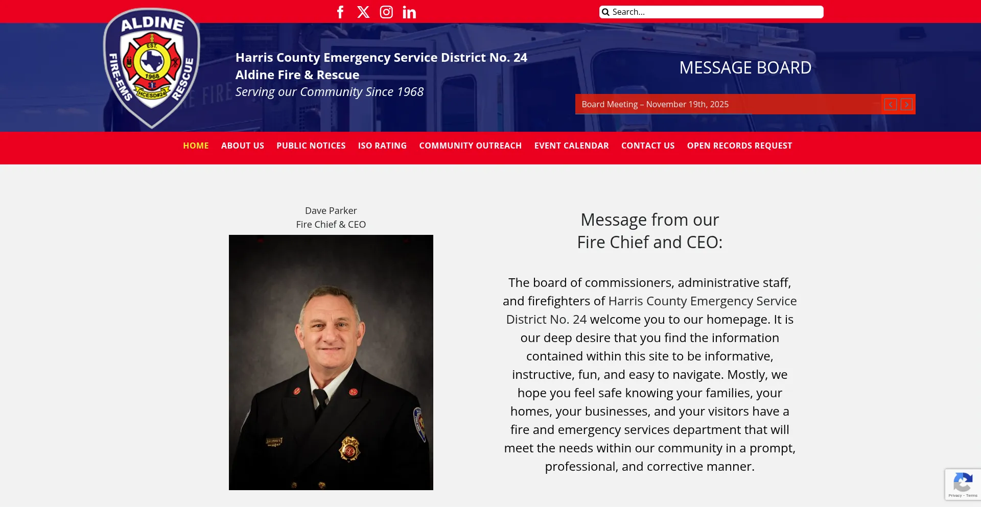 Dave Parker Fire Chief & CEO Message from our Fire Chief and CEO: The board of commissioners, administrative staff, and firefighters of Harris County Emergency Service Distric...