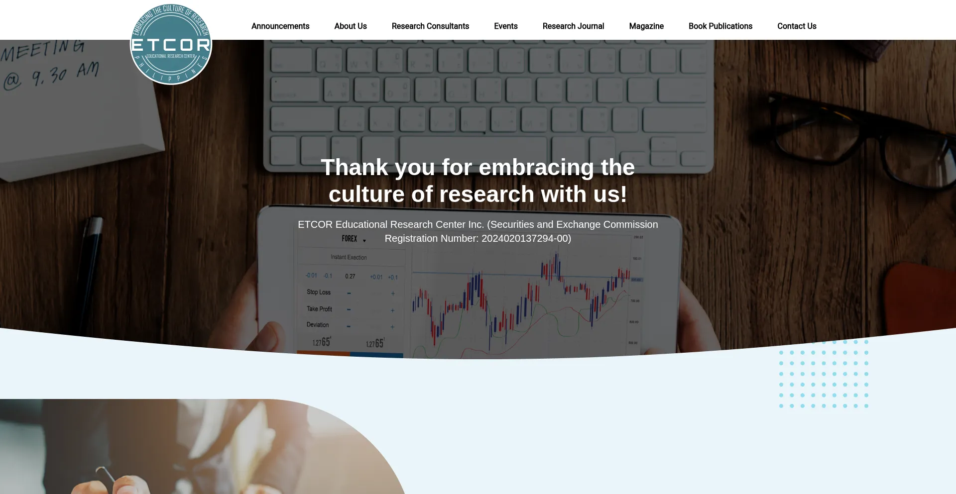 By promoting the culture of research to all people, ETCOR aims to contribute in improving the society through academic inquiries and in realizing that people conduct research fo...