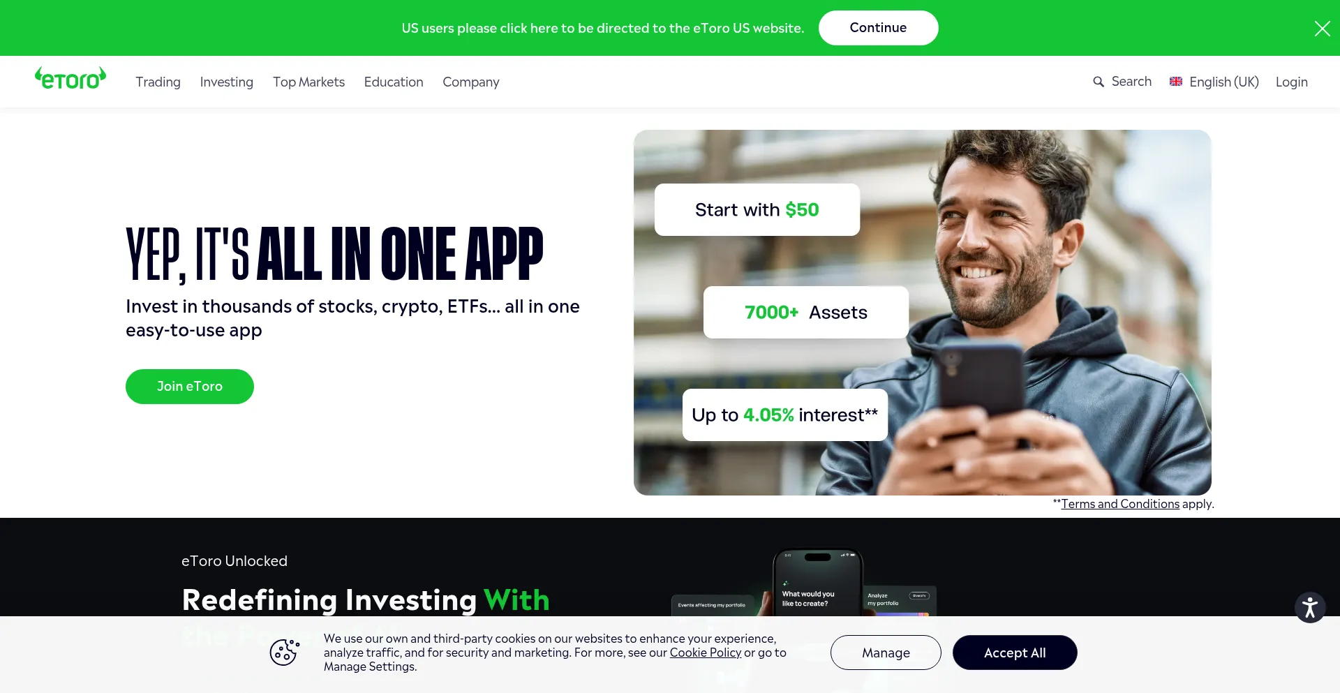 Join millions on eToro – the easy-to-use investing app with 7,000+ assets. Copy top investors and earn up to 4.3% interest on your uninvested balance.