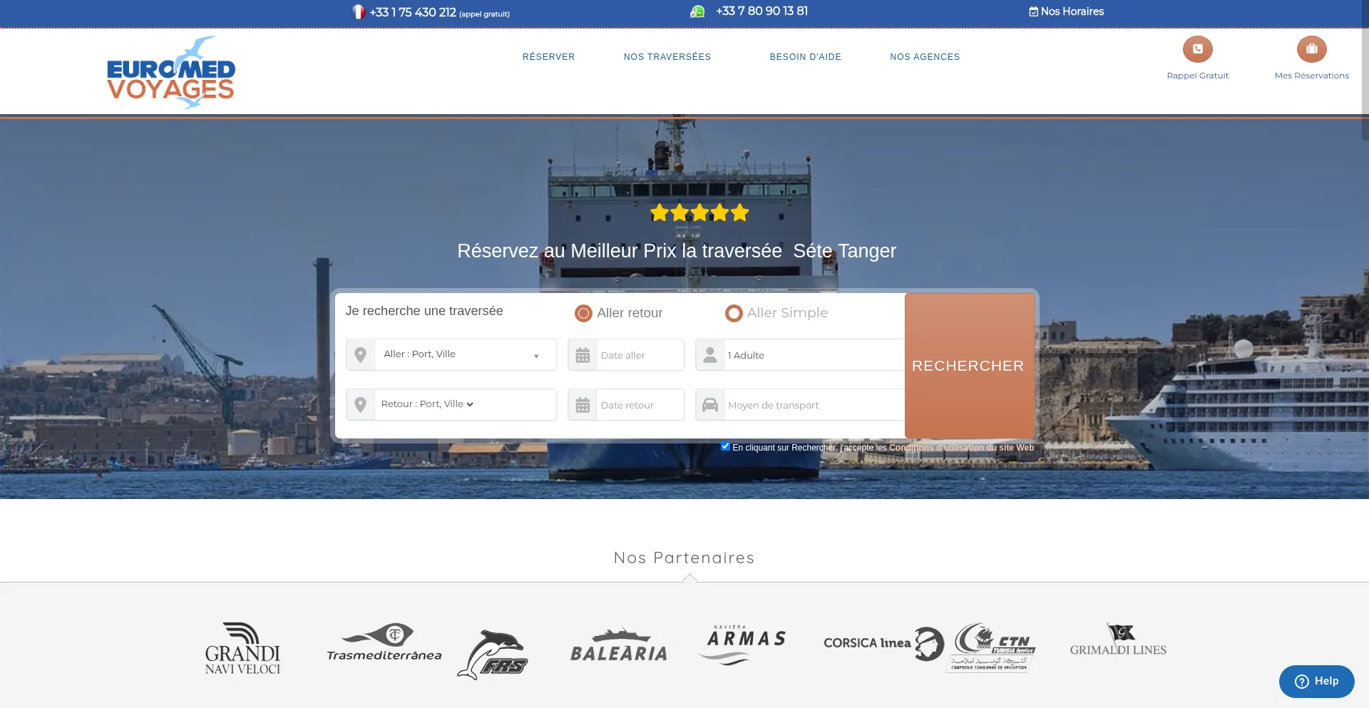 Réservez votre billet de bateau le moins cher vers le Maroc ( Sète Tanger ...), îles Baleares( Barcelone Majorque ...), Algérie ( Valence Mostaganem,..) et la Tunisie (Genes...