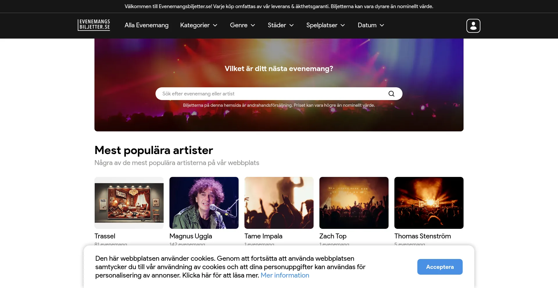 Hitta ditt nästa event! Bläddra, köp biljetter och njut av showen. Upptäck de mest populära evenemangen - konsert, teater, festival, sport, humor och show.