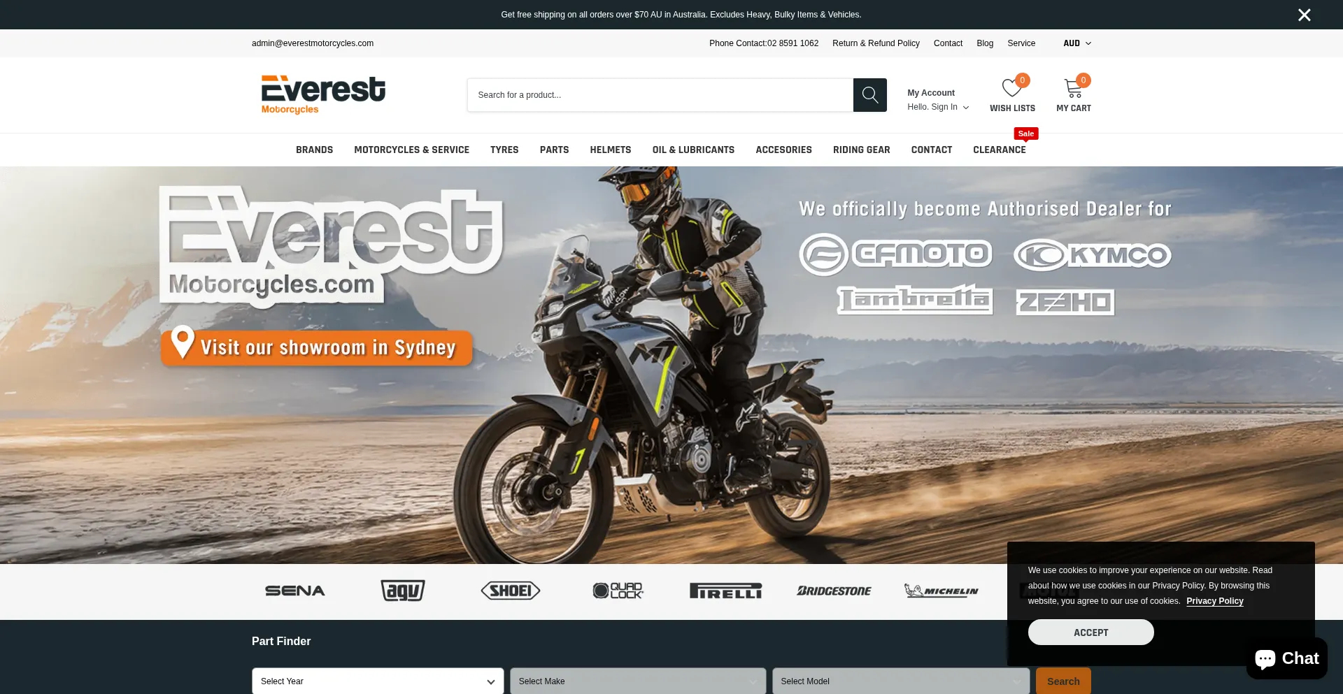 Everest Motorcycles is Australia’s trusted CFMOTO, KYMCO, LAMBRETTA & ZEEHO dealer. Explore motorcycles, riding gear, parts, and accessories from top brands. Over 30,000 produ...