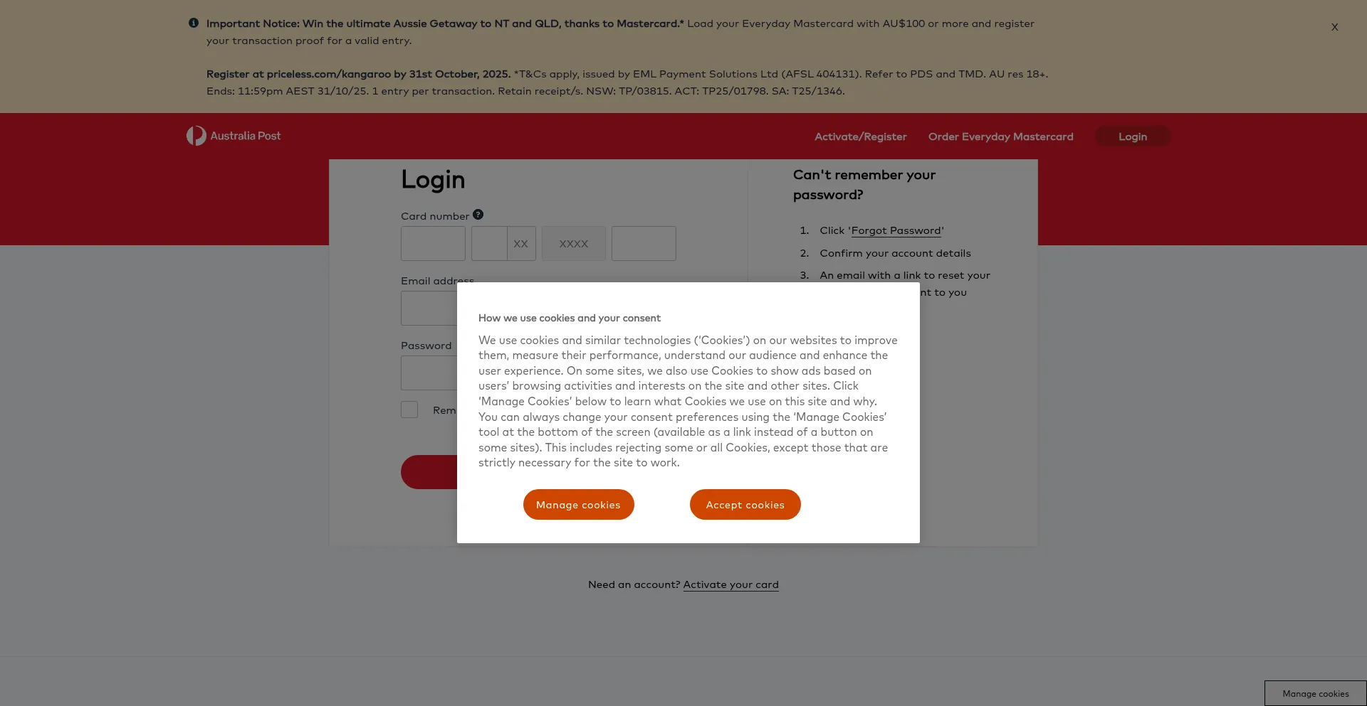 El sitio web implementa mecanismos de consentimiento de cookies en cumplimiento con regulaciones de privacidad como GDPR o CCPA. Esto demuestra que everyday.card.auspost adhiere a estándares de protección de datos y proporciona a los usuarios control sobre prácticas de recolección de datos personales.
