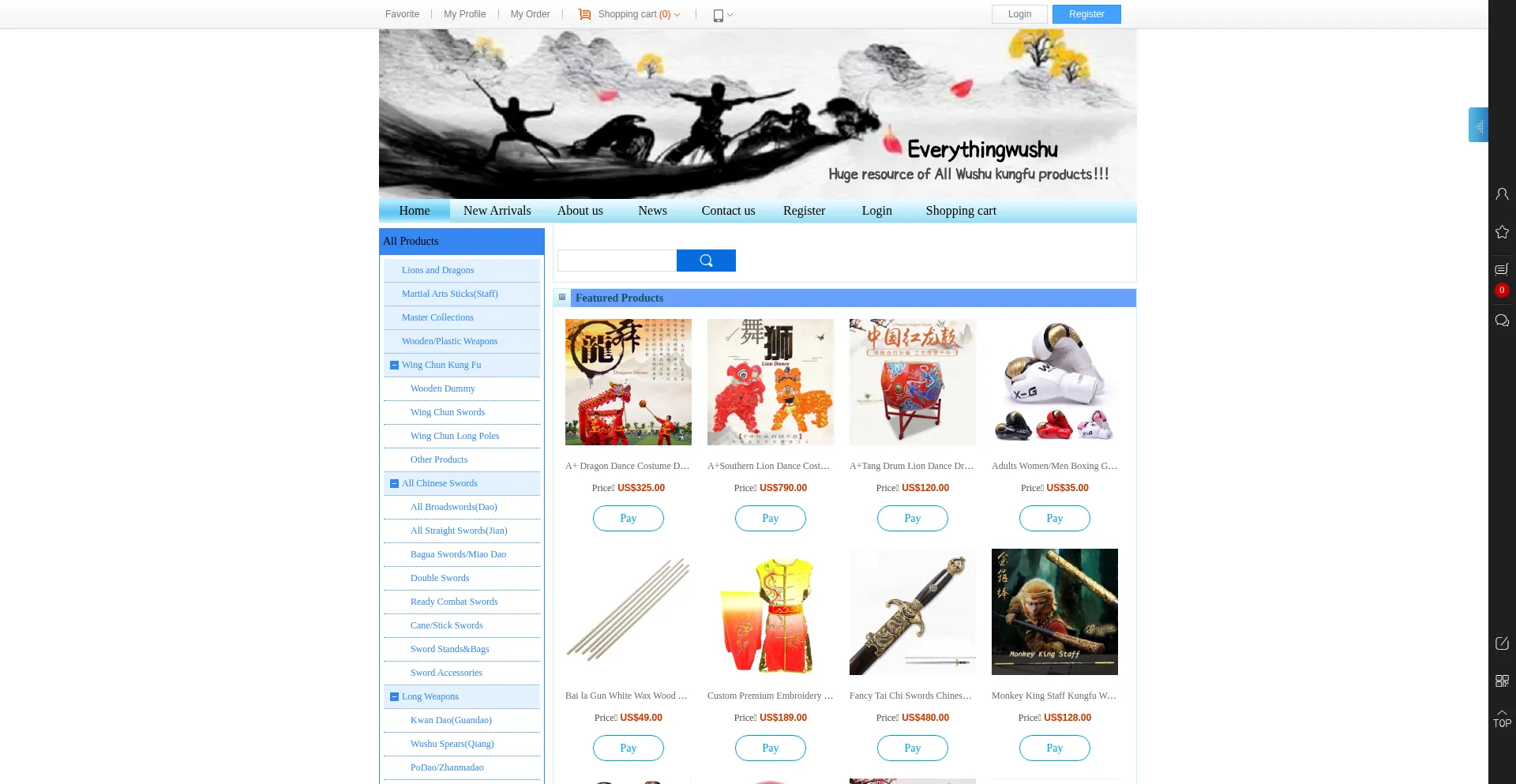 All chinese swords, katana, samurai armors, wushu kungfu products, wing chun wooden dummy, boxing gloves, martial arts shoes
