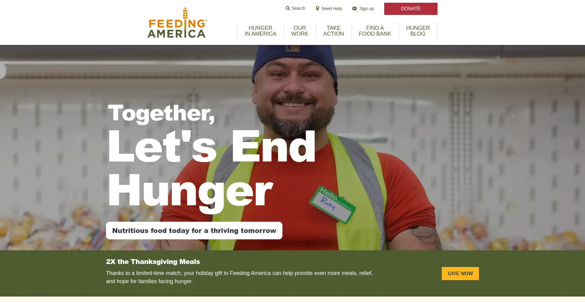 Feeding America is a nonprofit network of 200 food banks leading the fight against hunger in the United States. Learn how you can help end hunger in America.