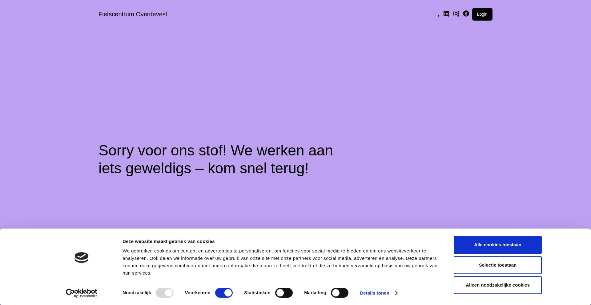 El sitio web implementa mecanismos de consentimiento de cookies en cumplimiento con regulaciones de privacidad como GDPR o CCPA. Esto demuestra que fietscentrum.nl adhiere a estándares de protección de datos y proporciona a los usuarios control sobre prácticas de recolección de datos personales.