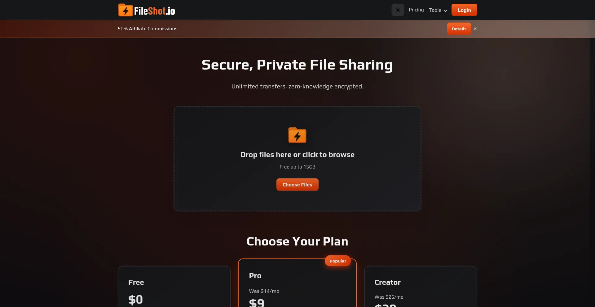 Share large files securely with zero-knowledge encryption. Free plan: 15 GB, 7-day expiry. Pro: $9/mo, 300 GB/month, 30-day expiry. Premium: $20/mo, unlimited storage & transfer...