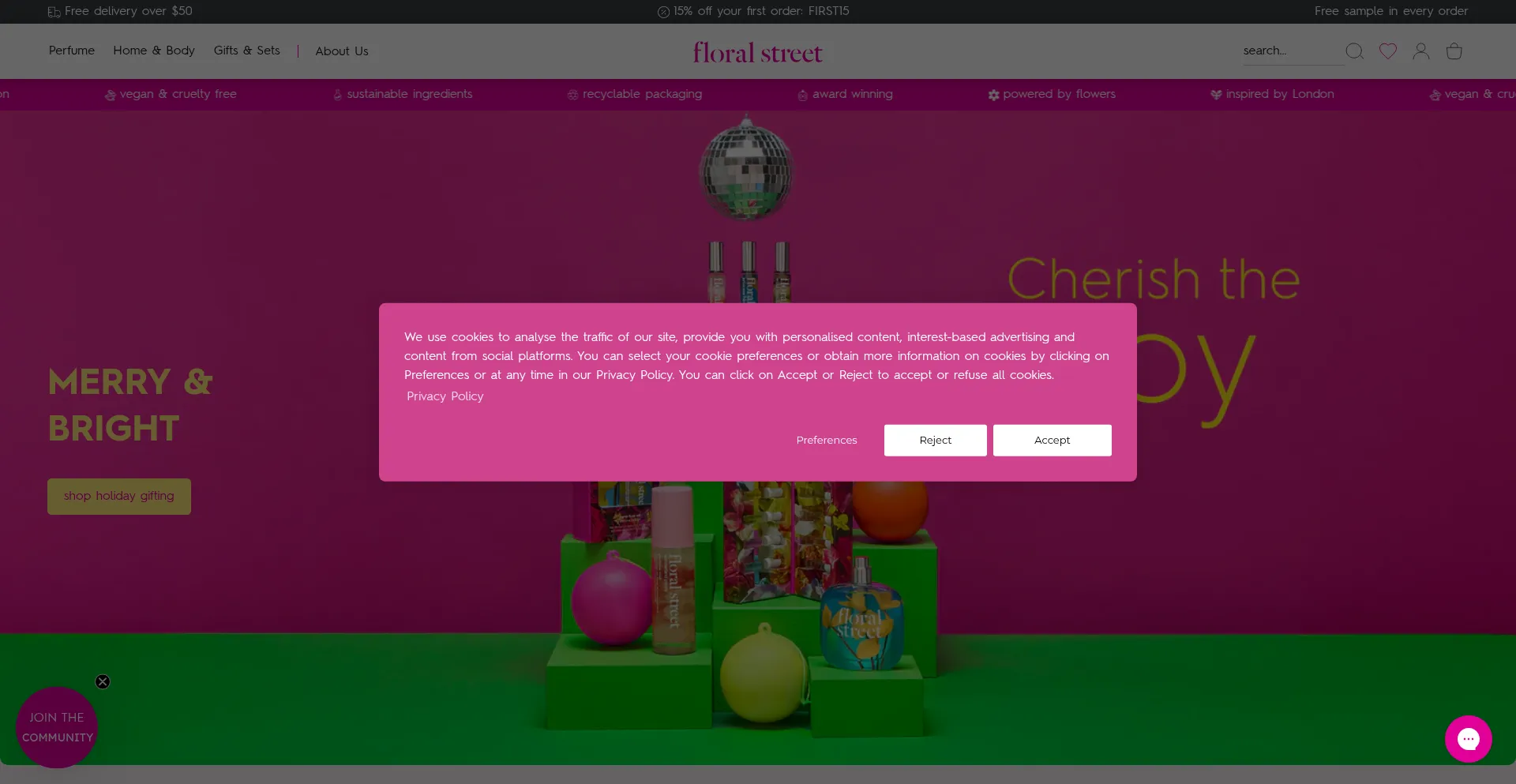 El sitio web implementa mecanismos de consentimiento de cookies en cumplimiento con regulaciones de privacidad como GDPR o CCPA. Esto demuestra que floralstreet.com adhiere a estándares de protección de datos y proporciona a los usuarios control sobre prácticas de recolección de datos personales.