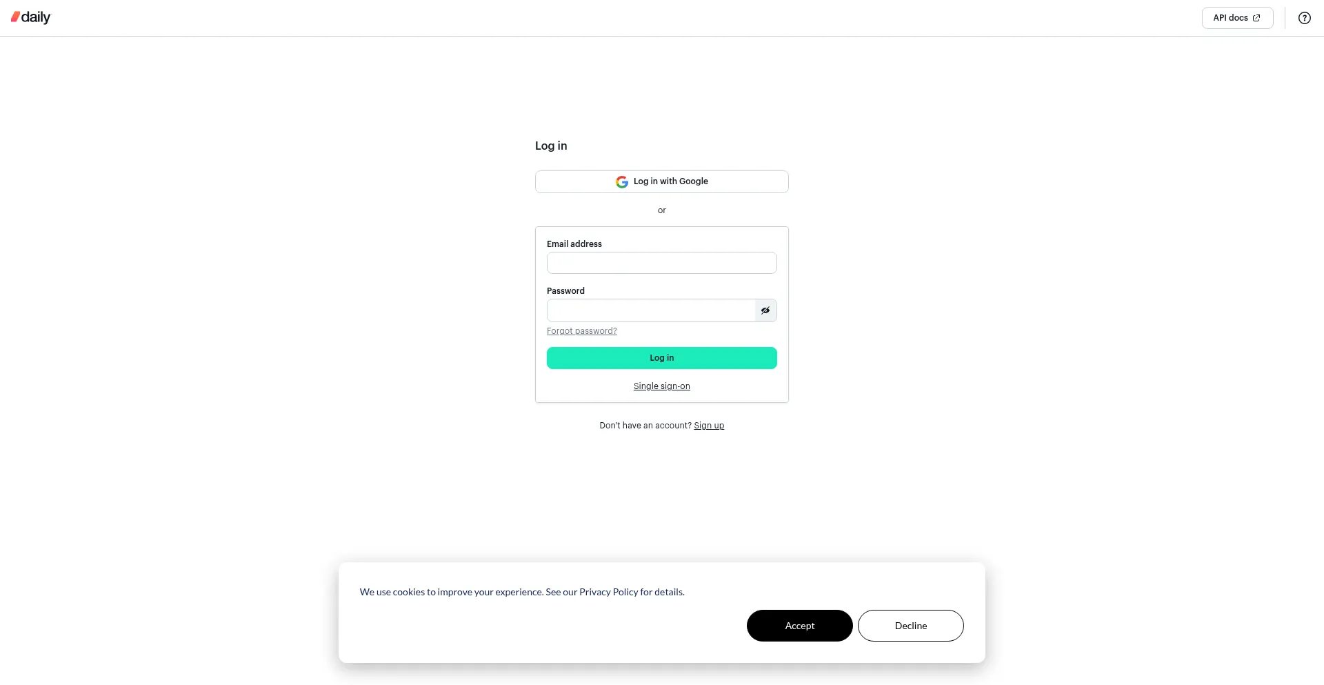 Log in to your Daily account to view your video call usage, create rooms, review call and API logs, manage your plan and team, and more.
