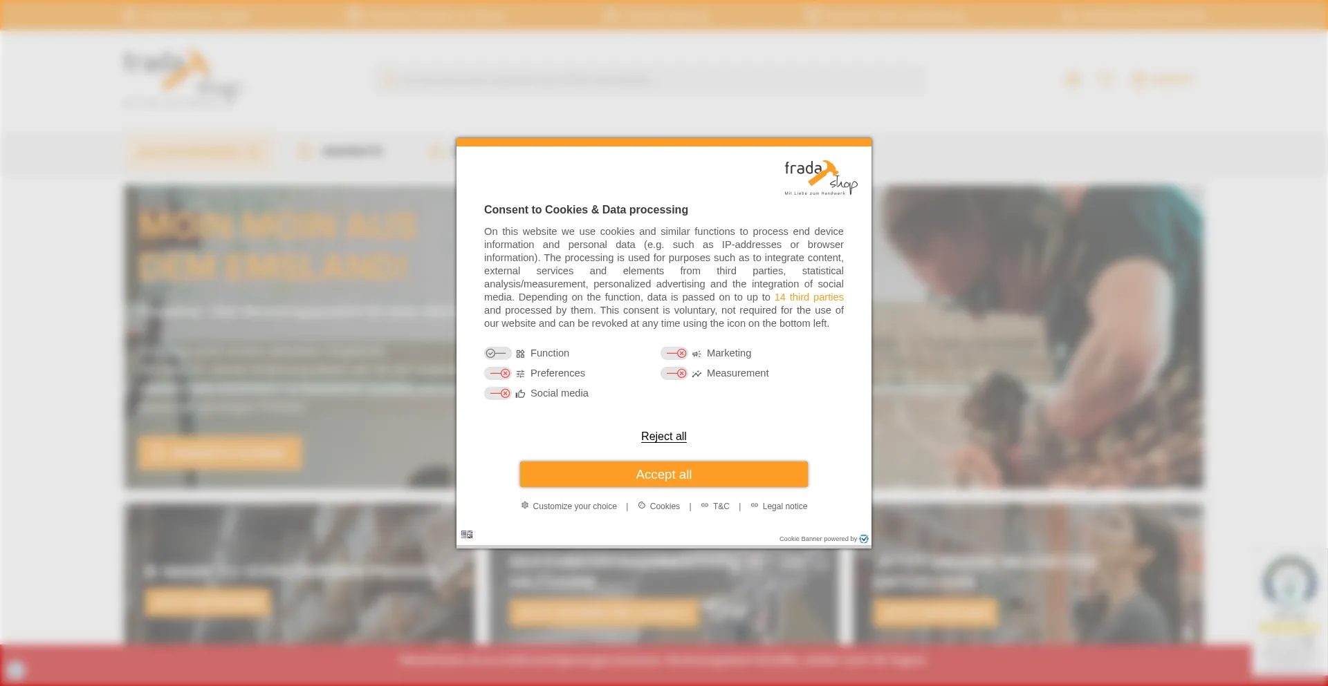 El sitio web implementa mecanismos de consentimiento de cookies en cumplimiento con regulaciones de privacidad como GDPR o CCPA. Esto demuestra que fradashop.de adhiere a estándares de protección de datos y proporciona a los usuarios control sobre prácticas de recolección de datos personales.