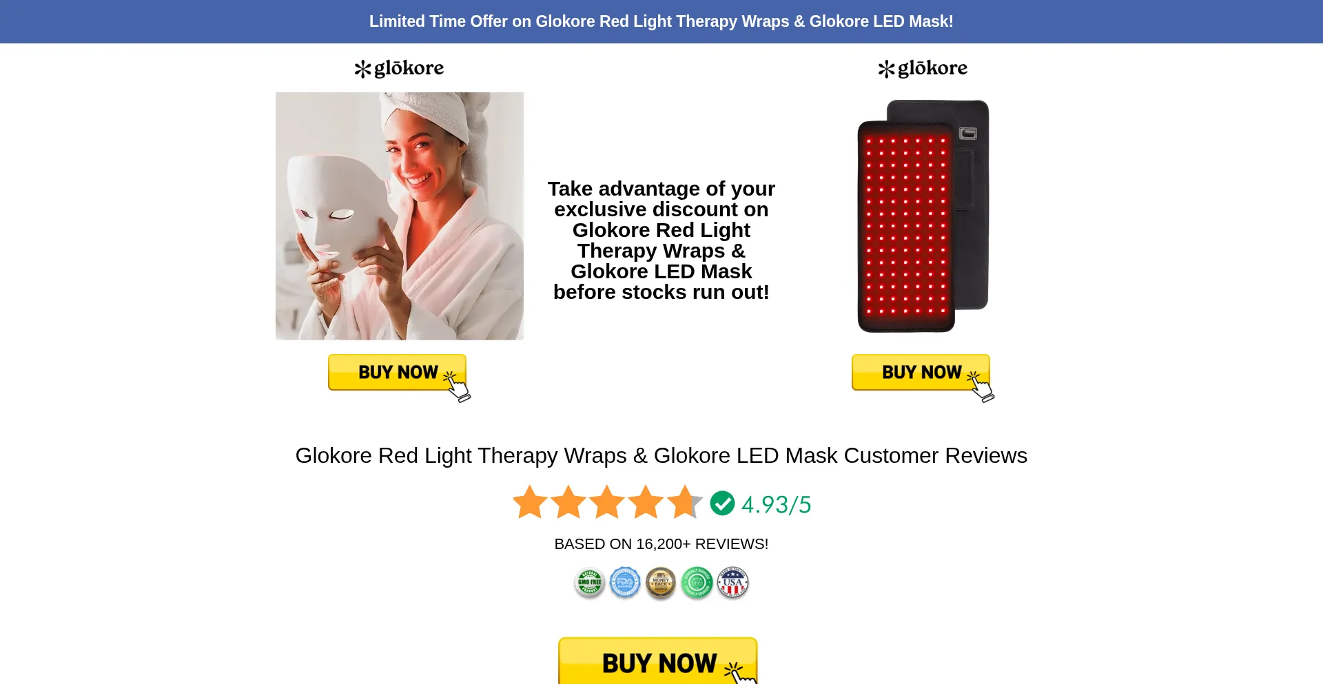Discover Glokore LED Mask for skin rejuvenation or Red Light Therapy Wraps for pain relief & recovery. Safe, effective light therapy