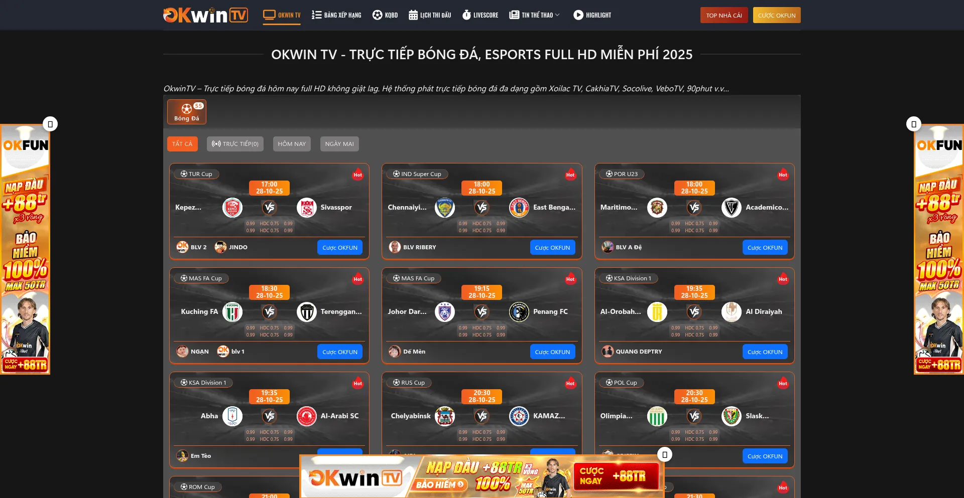 OkwinTV - Trực tiếp bóng đá hôm nay full HD không giật lag. Hệ thống phát trực tiếp bóng đá đa dạng gồm Xoilac TV, CakhiaTV, Socolive, VeboTV, 90phut...
