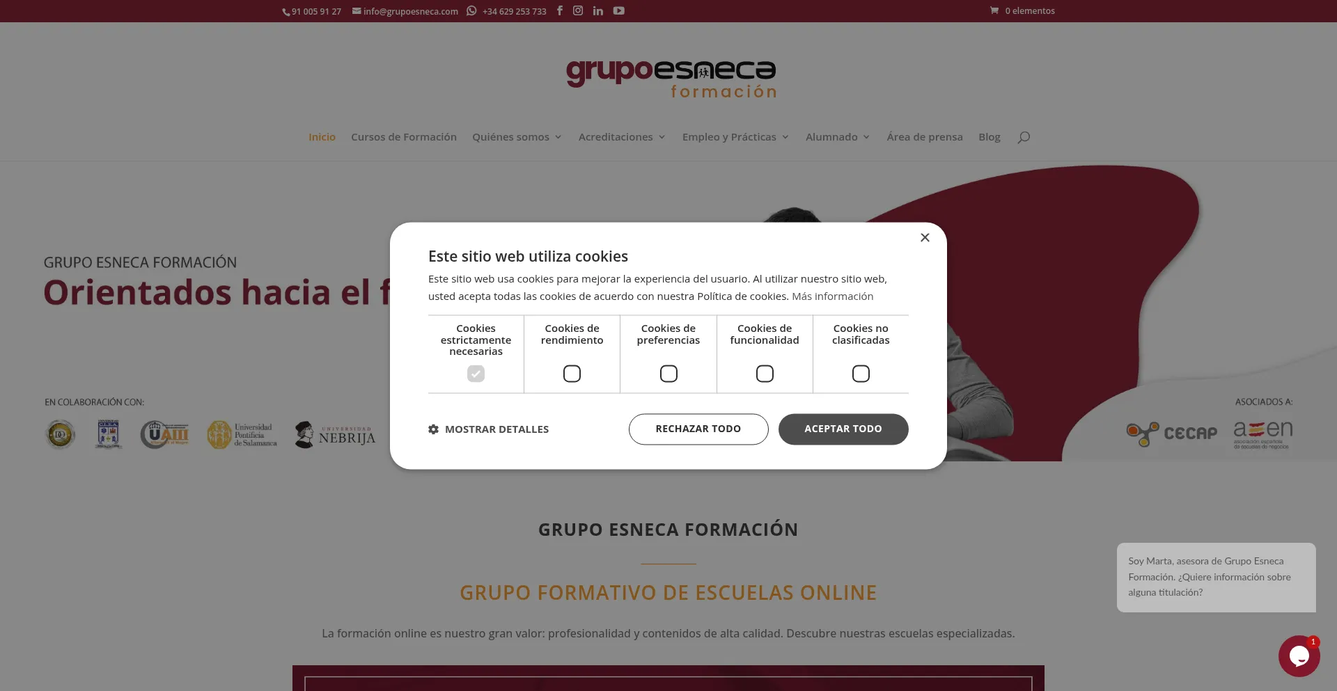 El sitio web implementa mecanismos de consentimiento de cookies en cumplimiento con regulaciones de privacidad como GDPR o CCPA. Esto demuestra que grupoesneca.com adhiere a estándares de protección de datos y proporciona a los usuarios control sobre prácticas de recolección de datos personales.