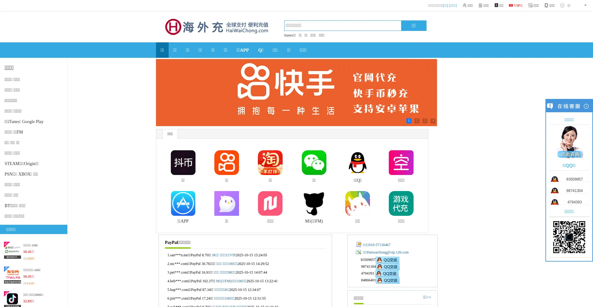 海外充官方网站,提供海外用户对抖音充值,Q币充值,直播平台、iTunes进行充值,从而让海外用户实现国内网上购物消费