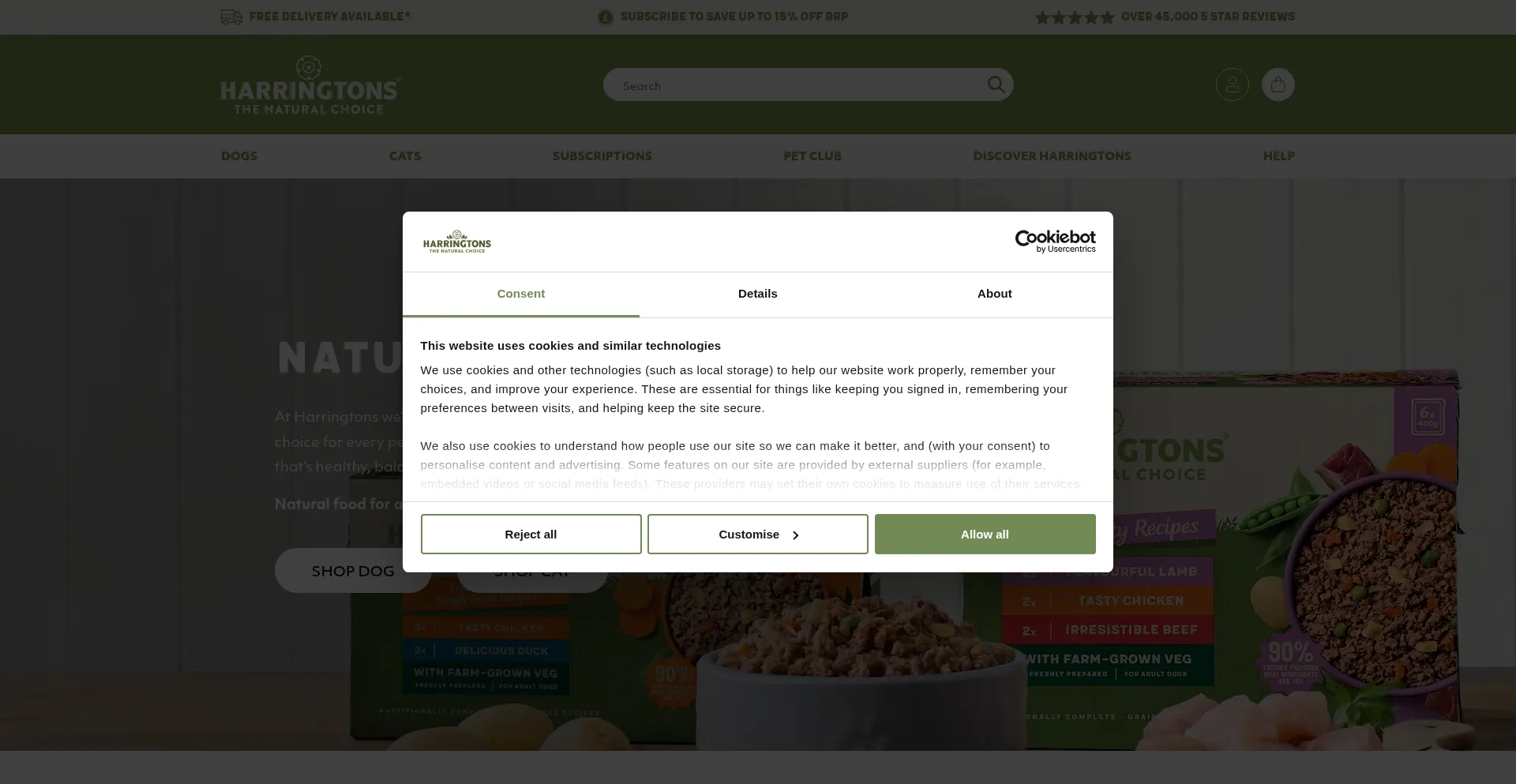 El sitio web implementa mecanismos de consentimiento de cookies en cumplimiento con regulaciones de privacidad como GDPR o CCPA. Esto demuestra que harringtonspetfood.com adhiere a estándares de protección de datos y proporciona a los usuarios control sobre prácticas de recolección de datos personales.