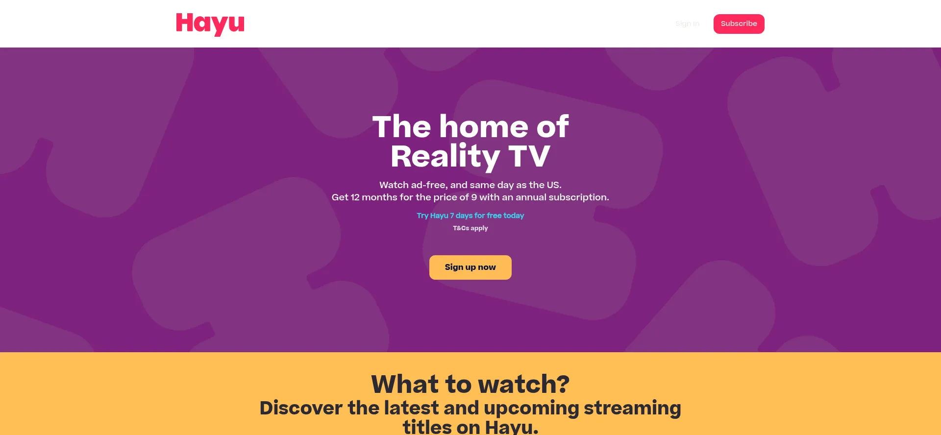 Stream reality TV on Hayu! Sign up now to get 12 months for the price of 9. Enjoy ad-free, same-day episodes as the US, and a 7-day free trial. Watch on multiple devices.