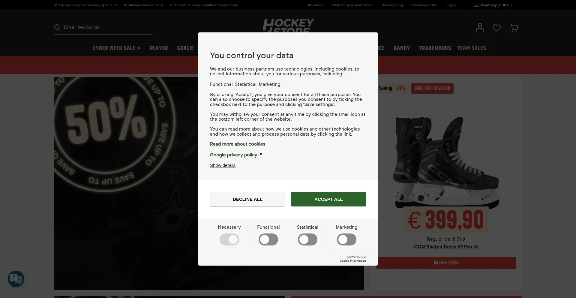 El sitio web implementa mecanismos de consentimiento de cookies en cumplimiento con regulaciones de privacidad como GDPR o CCPA. Esto demuestra que hockeystore.com adhiere a estándares de protección de datos y proporciona a los usuarios control sobre prácticas de recolección de datos personales.