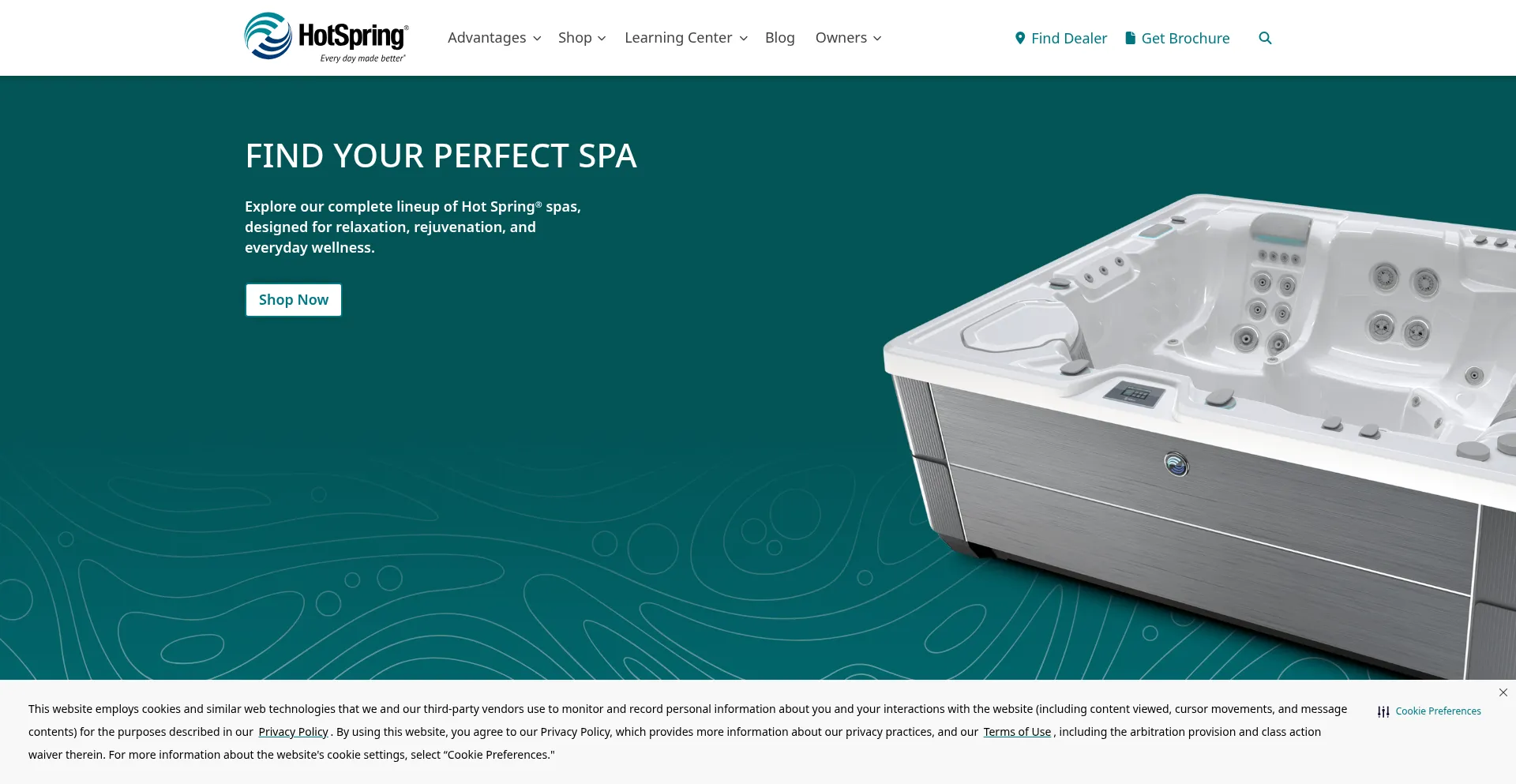 El sitio web implementa mecanismos de consentimiento de cookies en cumplimiento con regulaciones de privacidad como GDPR o CCPA. Esto demuestra que hotspring.com adhiere a estándares de protección de datos y proporciona a los usuarios control sobre prácticas de recolección de datos personales.