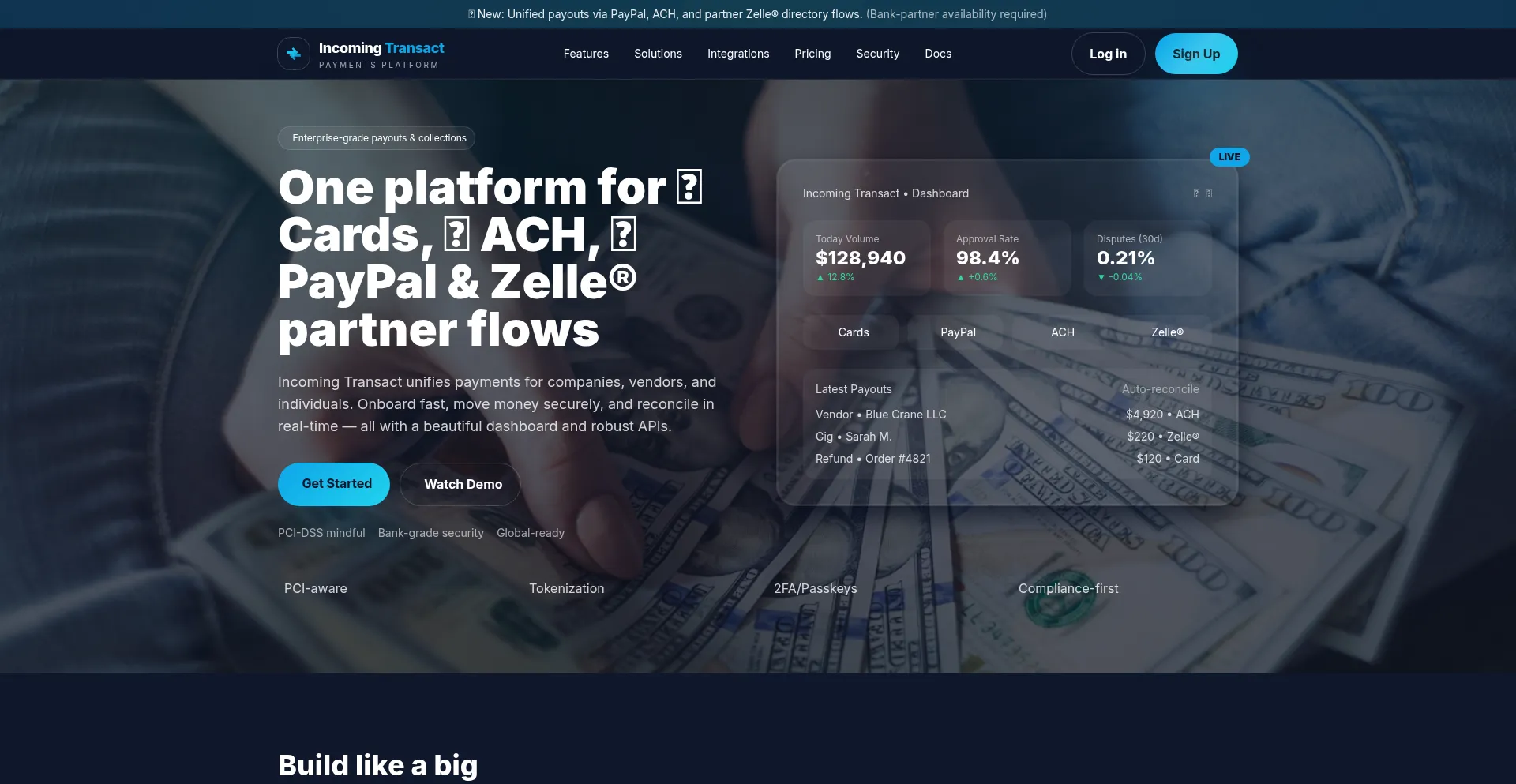Incoming Transact is a modern payments platform for companies, vendors, and individuals — supporting PayPal, Zelle® directory partner flows, ACH, and card processing with ban...