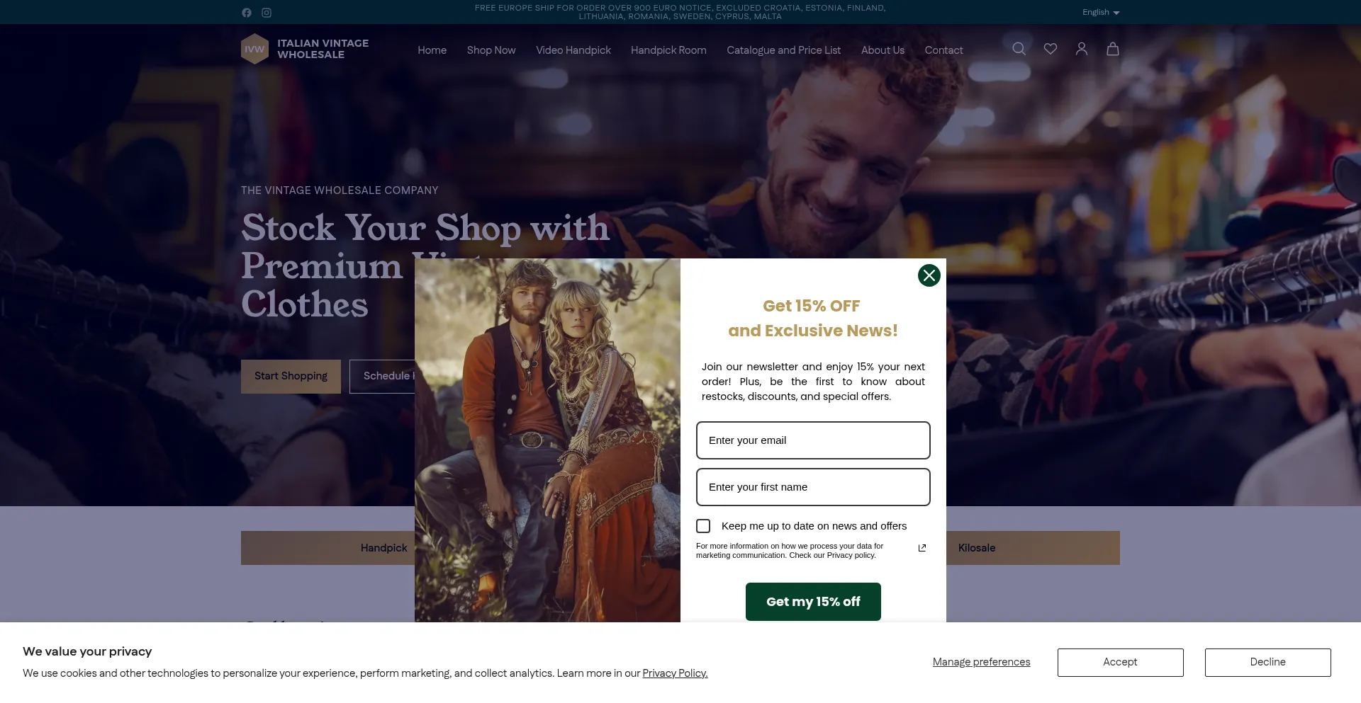 El sitio web implementa mecanismos de consentimiento de cookies en cumplimiento con regulaciones de privacidad como GDPR o CCPA. Esto demuestra que italianvintagewholesale.com adhiere a estándares de protección de datos y proporciona a los usuarios control sobre prácticas de recolección de datos personales.