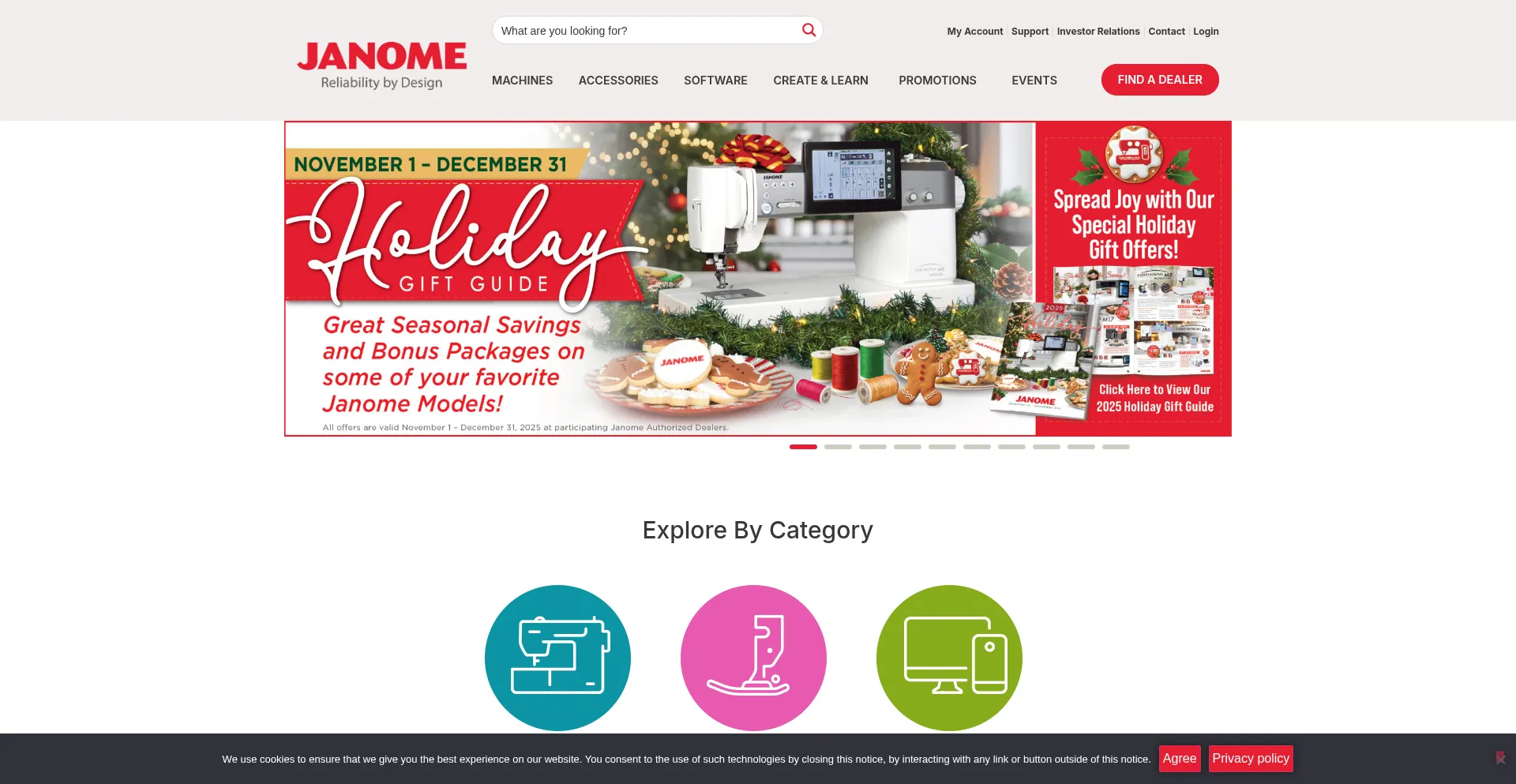 El sitio web implementa mecanismos de consentimiento de cookies en cumplimiento con regulaciones de privacidad como GDPR o CCPA. Esto demuestra que janome.com adhiere a estándares de protección de datos y proporciona a los usuarios control sobre prácticas de recolección de datos personales.