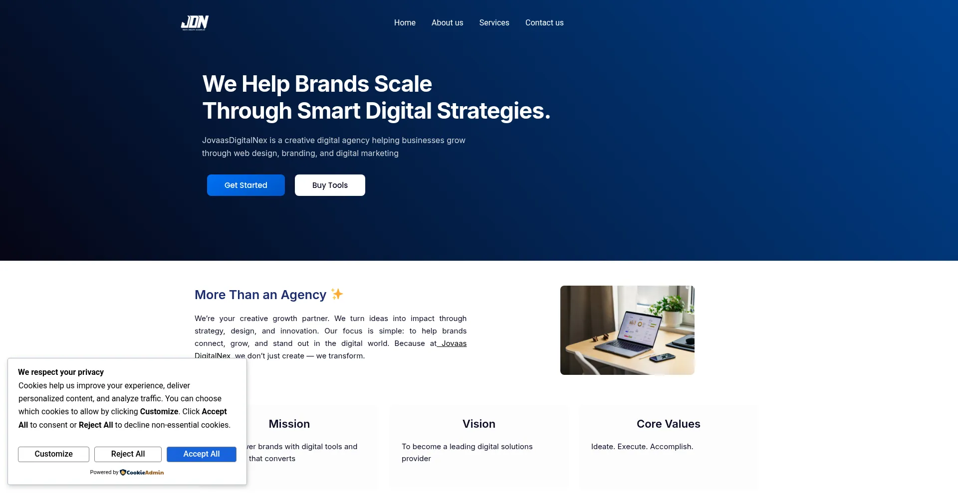El sitio web implementa mecanismos de consentimiento de cookies en cumplimiento con regulaciones de privacidad como GDPR o CCPA. Esto demuestra que jovaasdigitalnex.com adhiere a estándares de protección de datos y proporciona a los usuarios control sobre prácticas de recolección de datos personales.