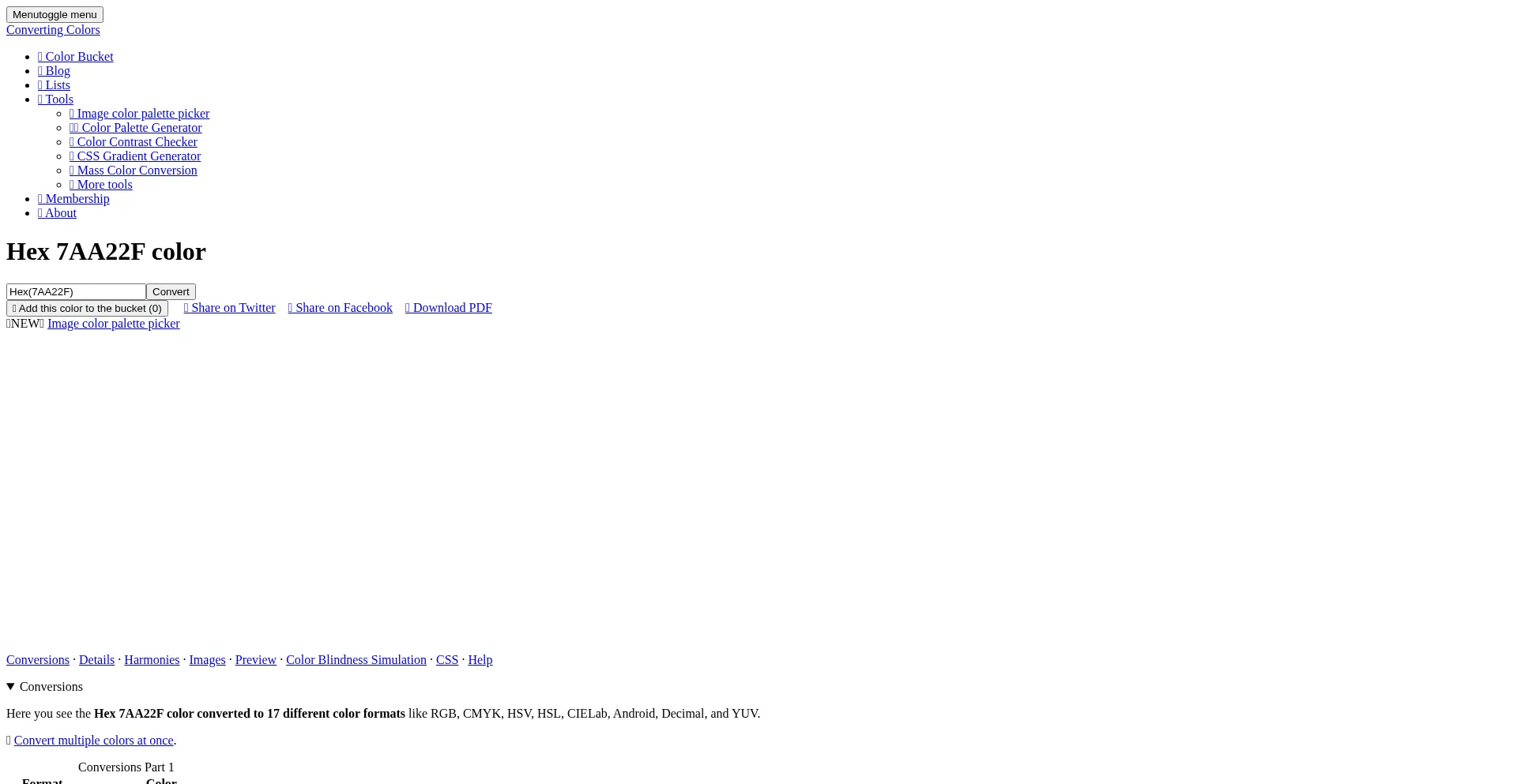 Hex 7AA22F color converted to 17 different formats like RGB, CMYK, HSV, HSL.The Hex color 7AA22F is a dark color, and the websafe version is hex 669933. A complement of this col...