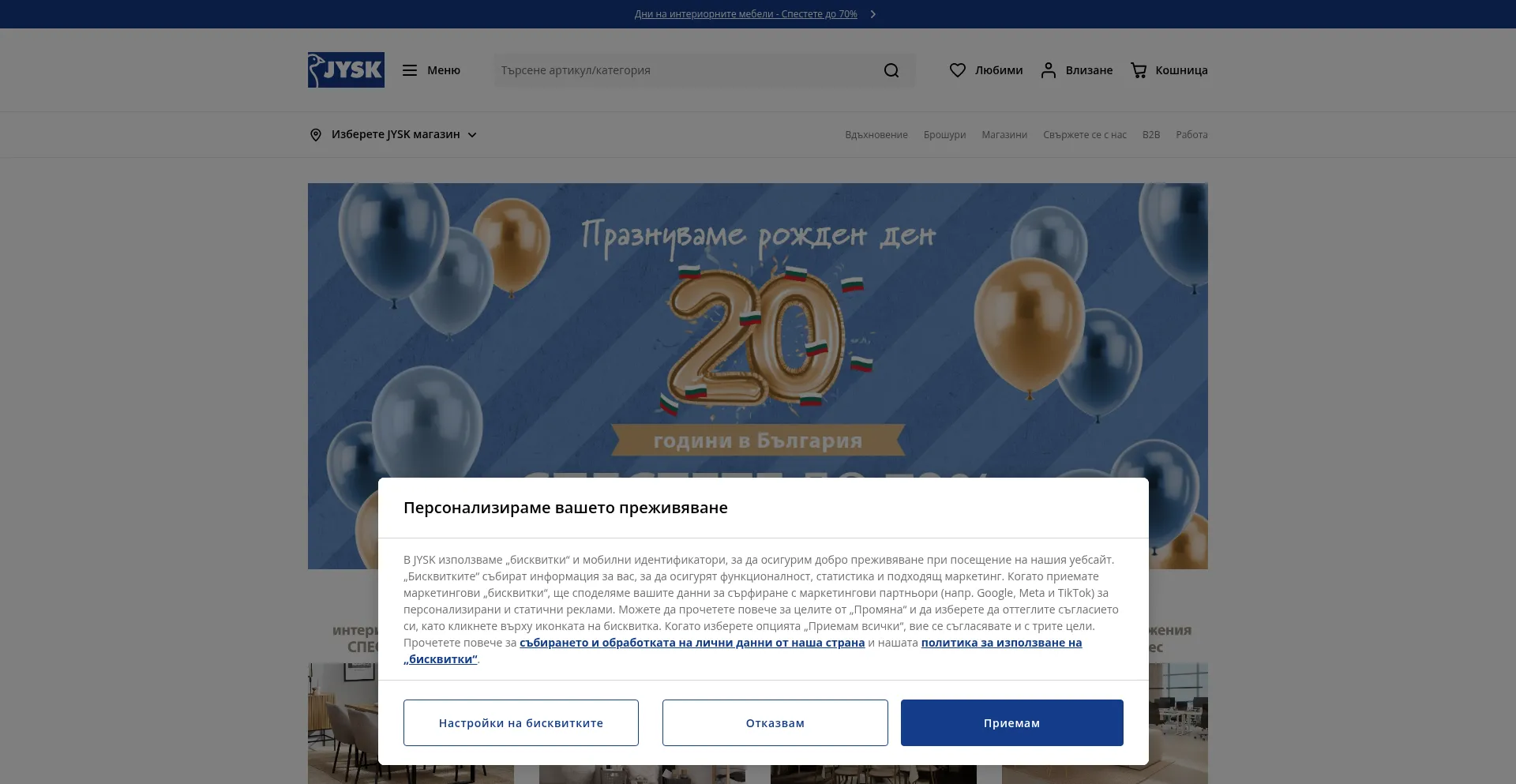 El sitio web implementa mecanismos de consentimiento de cookies en cumplimiento con regulaciones de privacidad como GDPR o CCPA. Esto demuestra que jysk.bg adhiere a estándares de protección de datos y proporciona a los usuarios control sobre prácticas de recolección de datos personales.