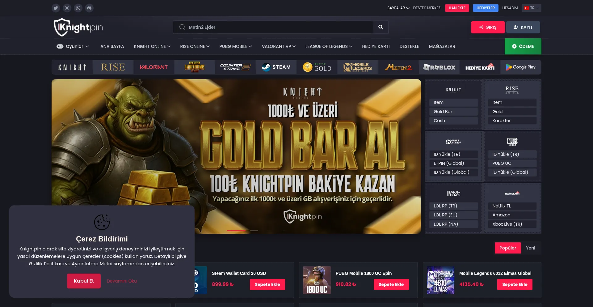 KnightPin Hızlı Güvenli Alışveriş Türkiye'nin en yenilikçi oyun pazaryeri! Gold, item, skin, e-pin ve hediye kartlarıyla yeni nesil alışveriş deneyimini keşfet.