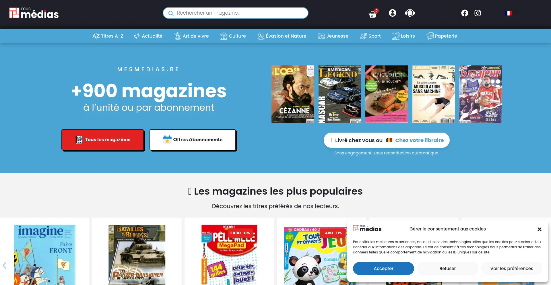 Librairie en ligne belge 100 % presse : plus de 900 magazines à l’unité ou par abonnement, avec livraison à domicile ou retrait en librairie.