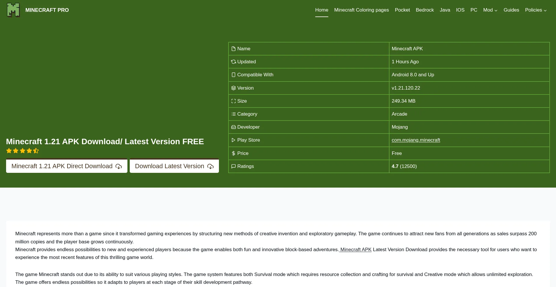 Download Minecraft APK 1.21/ Latest version October 24, 2025 . Learn features, installation, updates, fixes, and alternatives in this comprehensive guide. FAQs included.