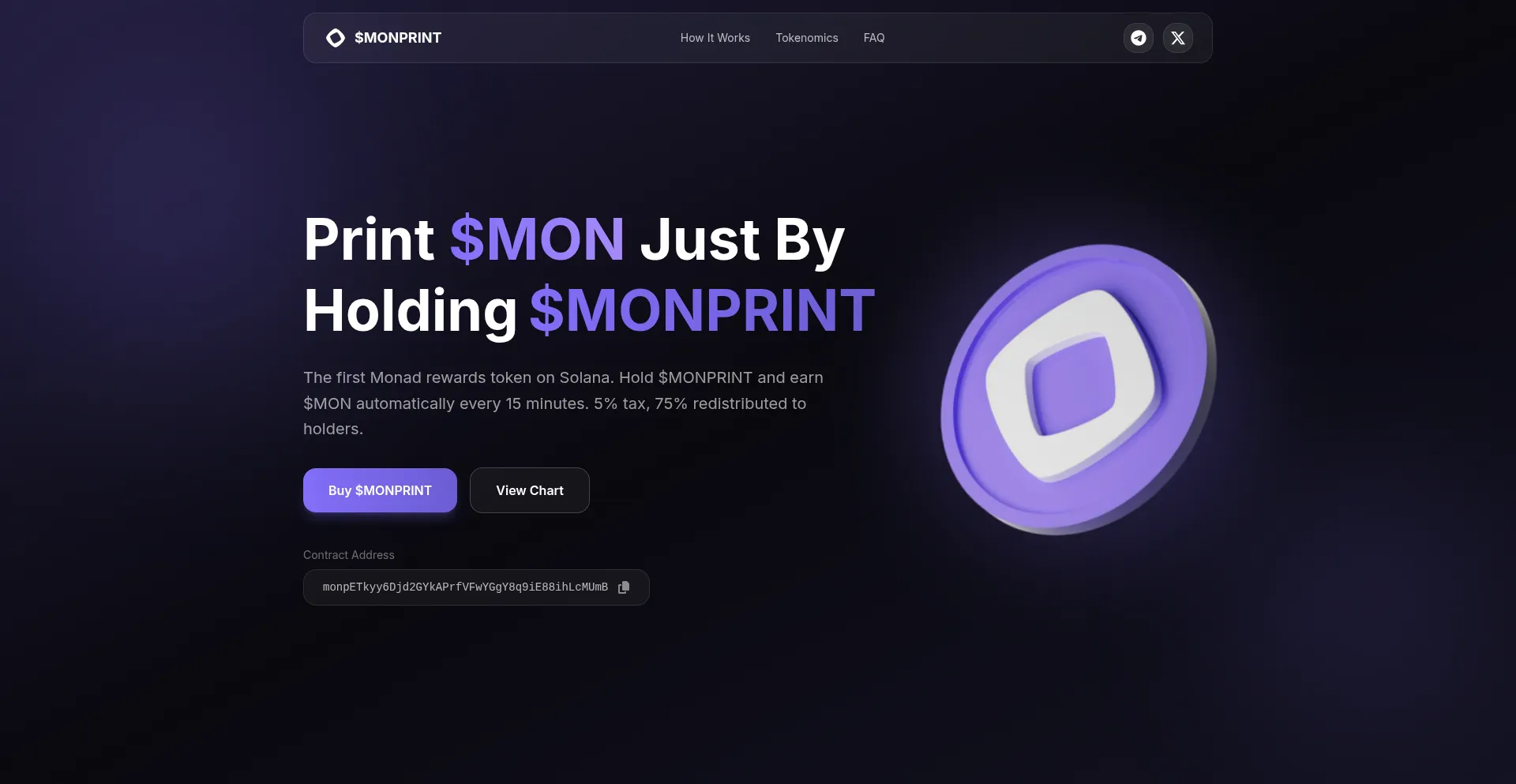 The first Monad rewards token on Solana. Hold $MONPRINT and earn $MON automatically every 15 minutes. 5% tax, 75% redistributed to holders.