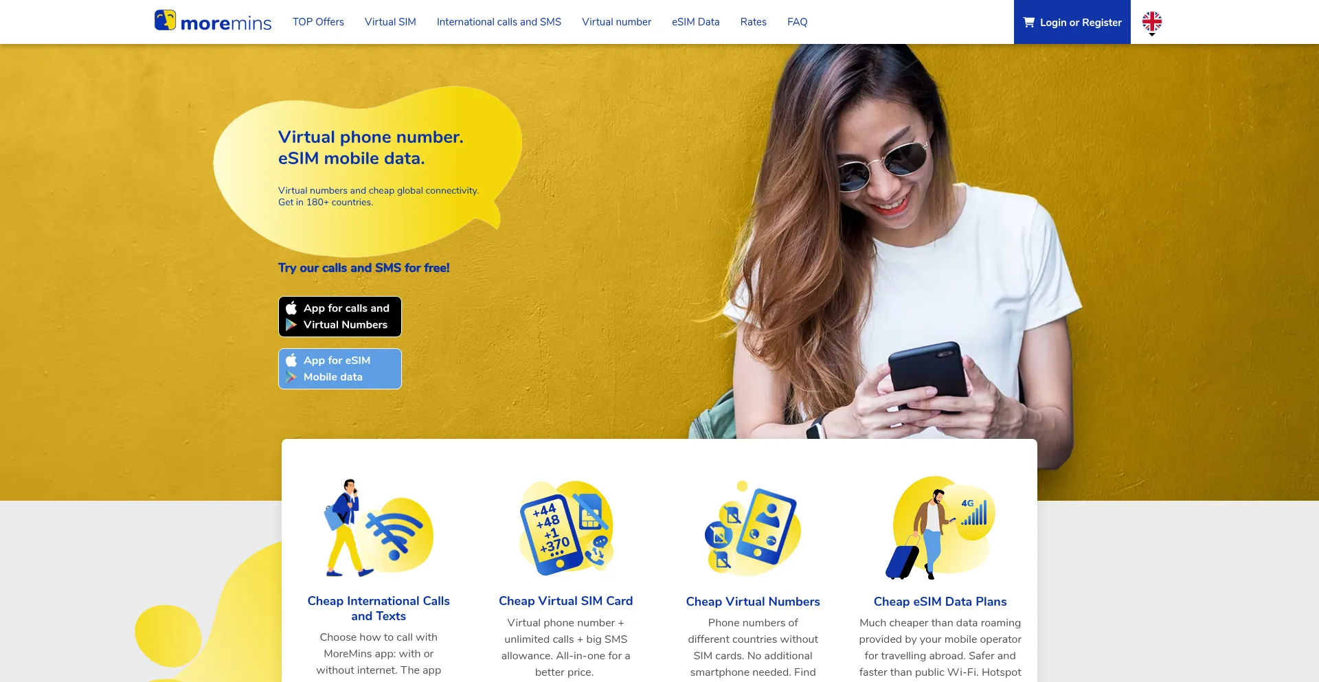 SIM-free virtual phone number, cheap international calls and eSIM internet. Works in 180+ countries. Rates from $0.99/month. All in the MoreMins app.