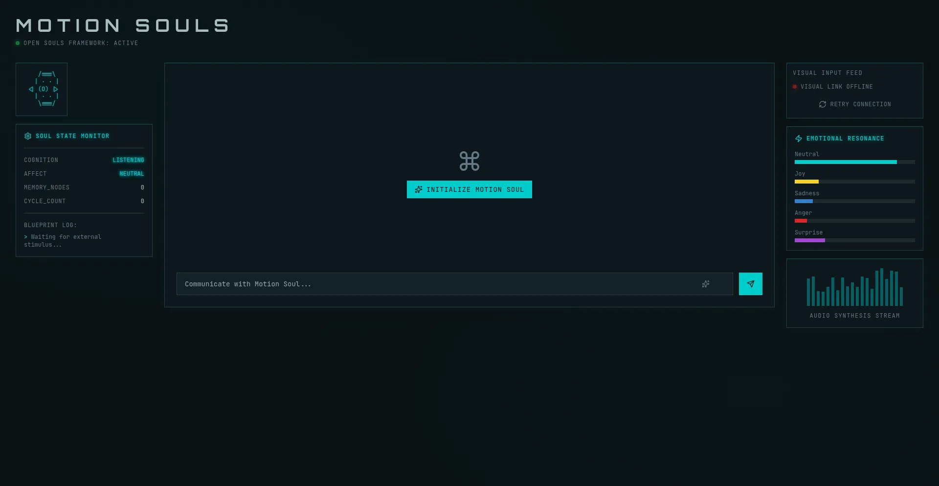 Motion Souls - An interactive AI soul framework interface with emotional resonance and cognitive monitoring.
