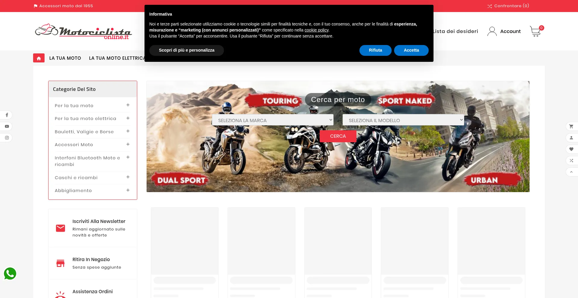 E-commerce con migliaia di articoli per la moto. Abbigliamento, accessori, antifurti, caschi, borse. Givi, Tucano, Clover, Hepco&Becker e SW-Motech