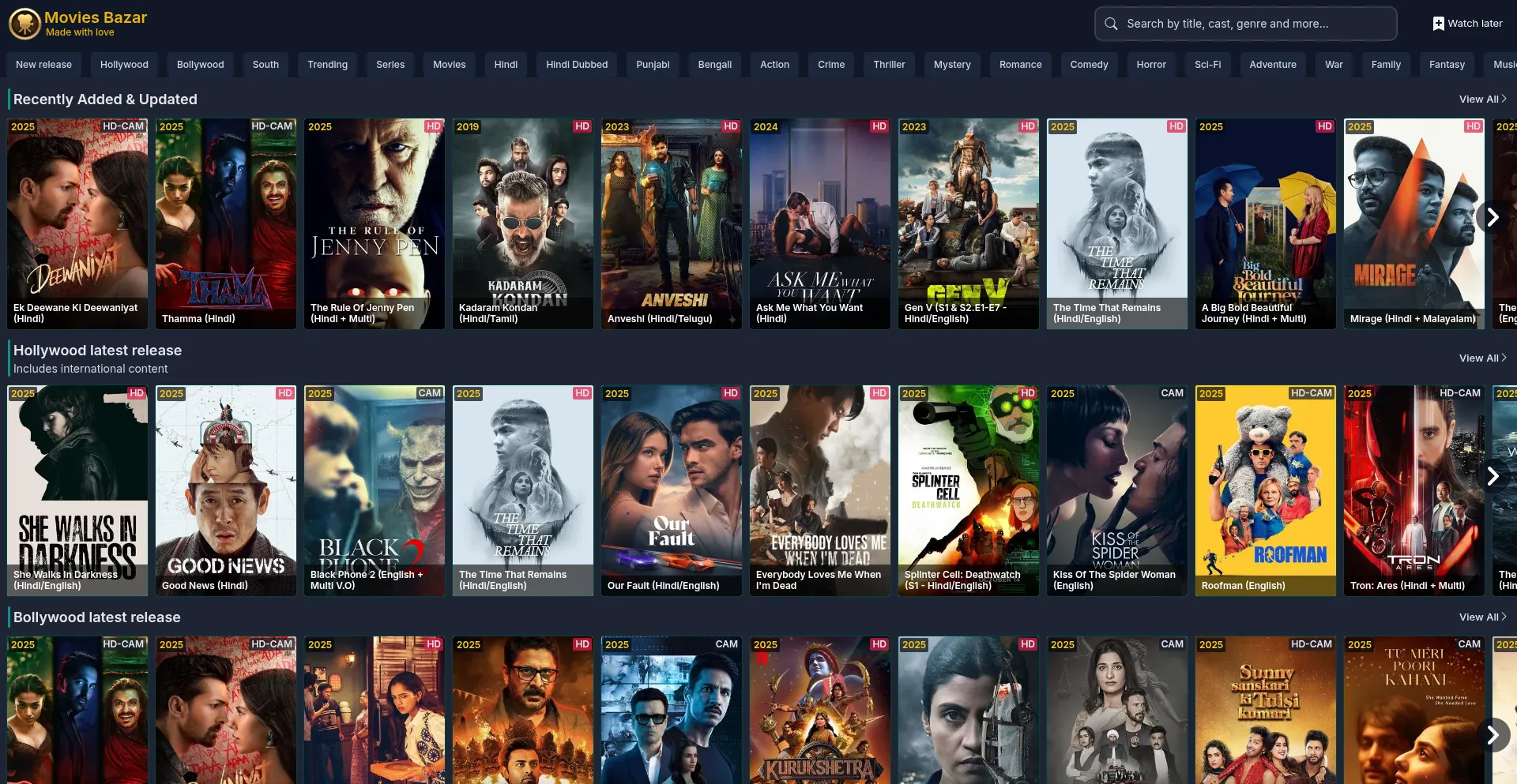 Watch latest release bollywood, hollywood, south, hindi dubbed, and more movies online with multi audio and multi quality upto 1080P Movies Bazar