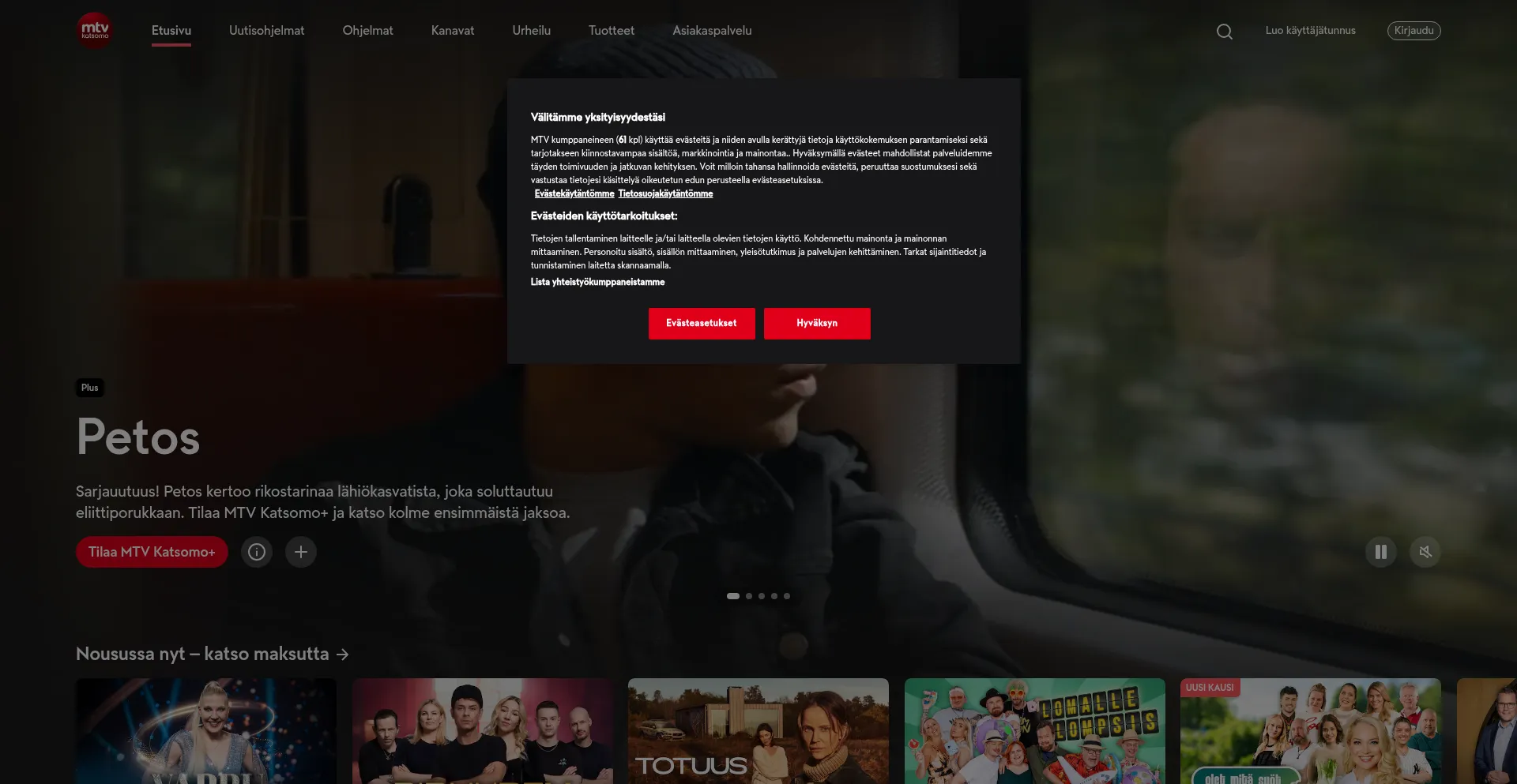 El sitio web implementa mecanismos de consentimiento de cookies en cumplimiento con regulaciones de privacidad como GDPR o CCPA. Esto demuestra que mtv.fi adhiere a estándares de protección de datos y proporciona a los usuarios control sobre prácticas de recolección de datos personales.