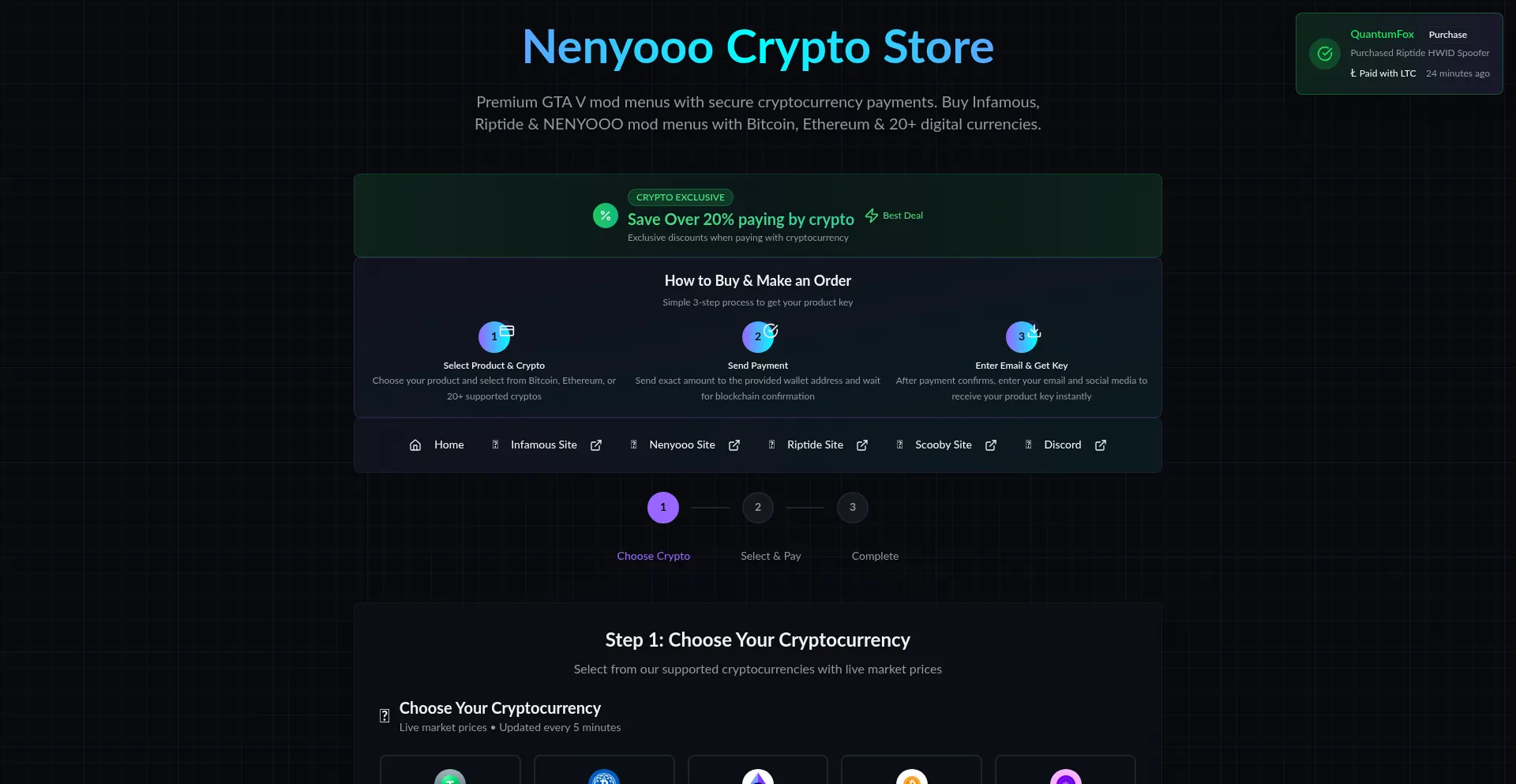Buy premium GTA 5 mod menus with cryptocurrency. Secure payments with Bitcoin, Ethereum & 20+ cryptos. Infamous, Riptide & NENYOOO mod menus for Grand Theft Auto V online.