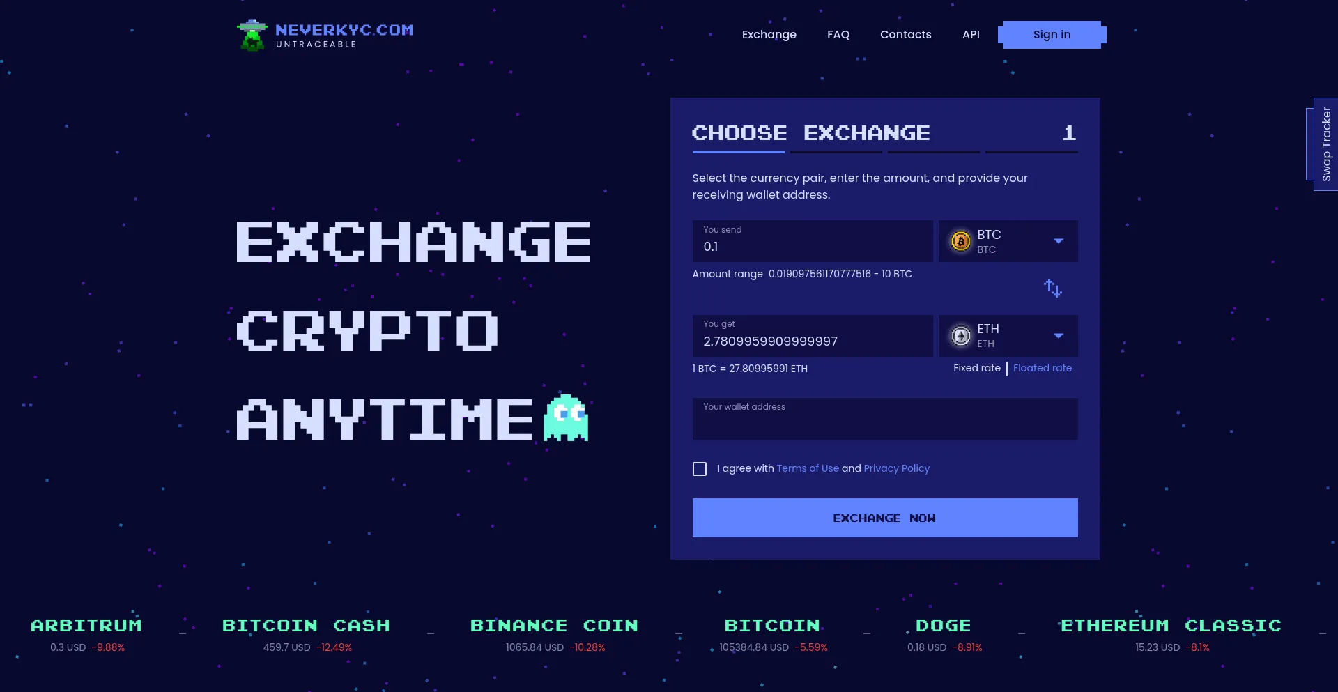 NEVERKYC.COM UNTRACEABLE. Exchange crypto anytime.