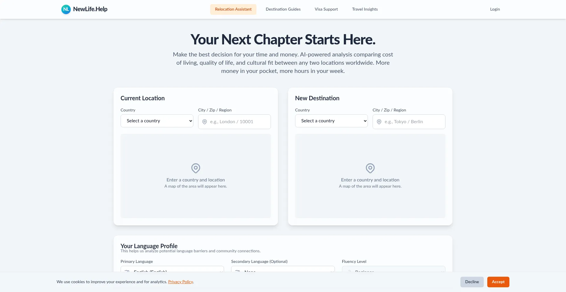 Plan your move abroad with NewLife.Help's All-In-One relocation assistant. Get personalized insights on visas, cost of living, jobs, and more for your new destination.