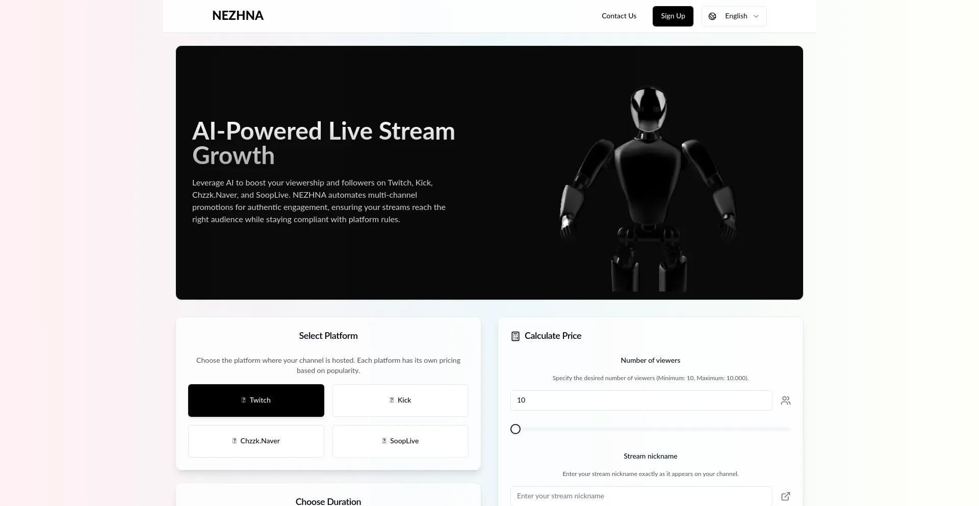 Boost your viewership and followers on Twitch, Kick, Chzzk.Naver, and SoopLive with NEZHNA's AI-powered growth services. Get real engagement and grow your audience.