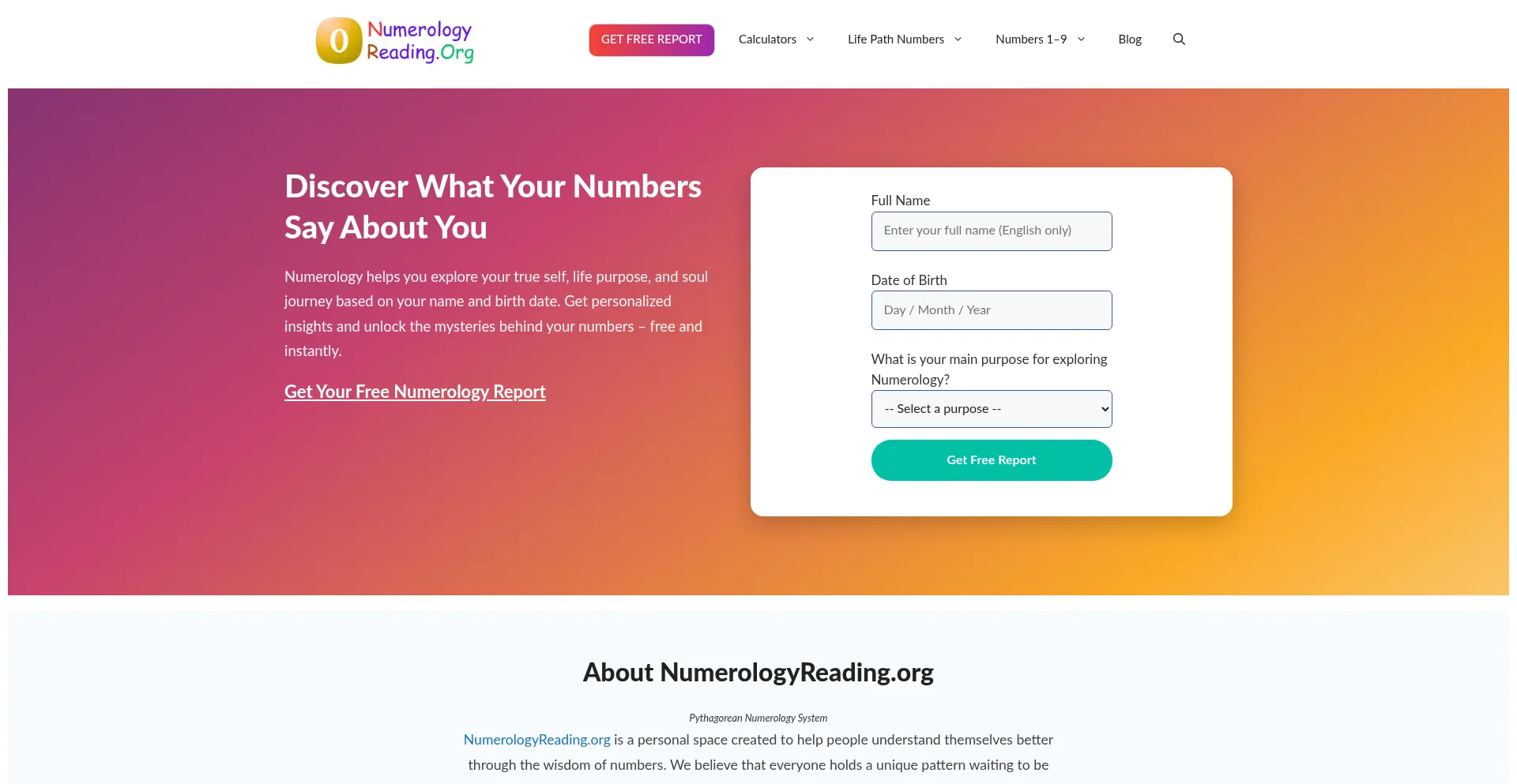 Get your free numerology reading online. Use our calculators to discover Life Path, Destiny, Soul Urge, and more. Unlock your full numerology report today.