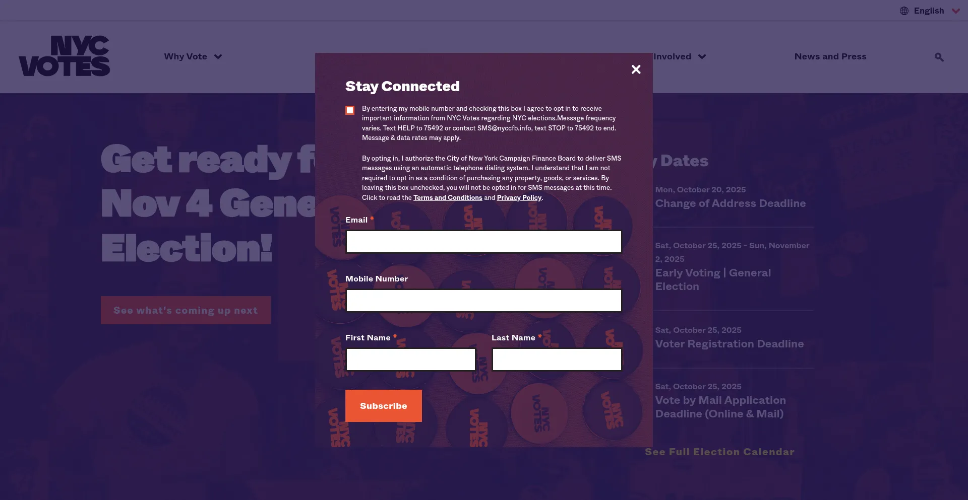 El sitio web implementa formularios de recolección de datos solicitando información personal incluyendo nombres, direcciones de correo electrónico, números de teléfono u otros detalles sensibles. Los usuarios deben verificar la legitimidad de nycvotes.org y revisar políticas de privacidad antes de enviar datos personales.