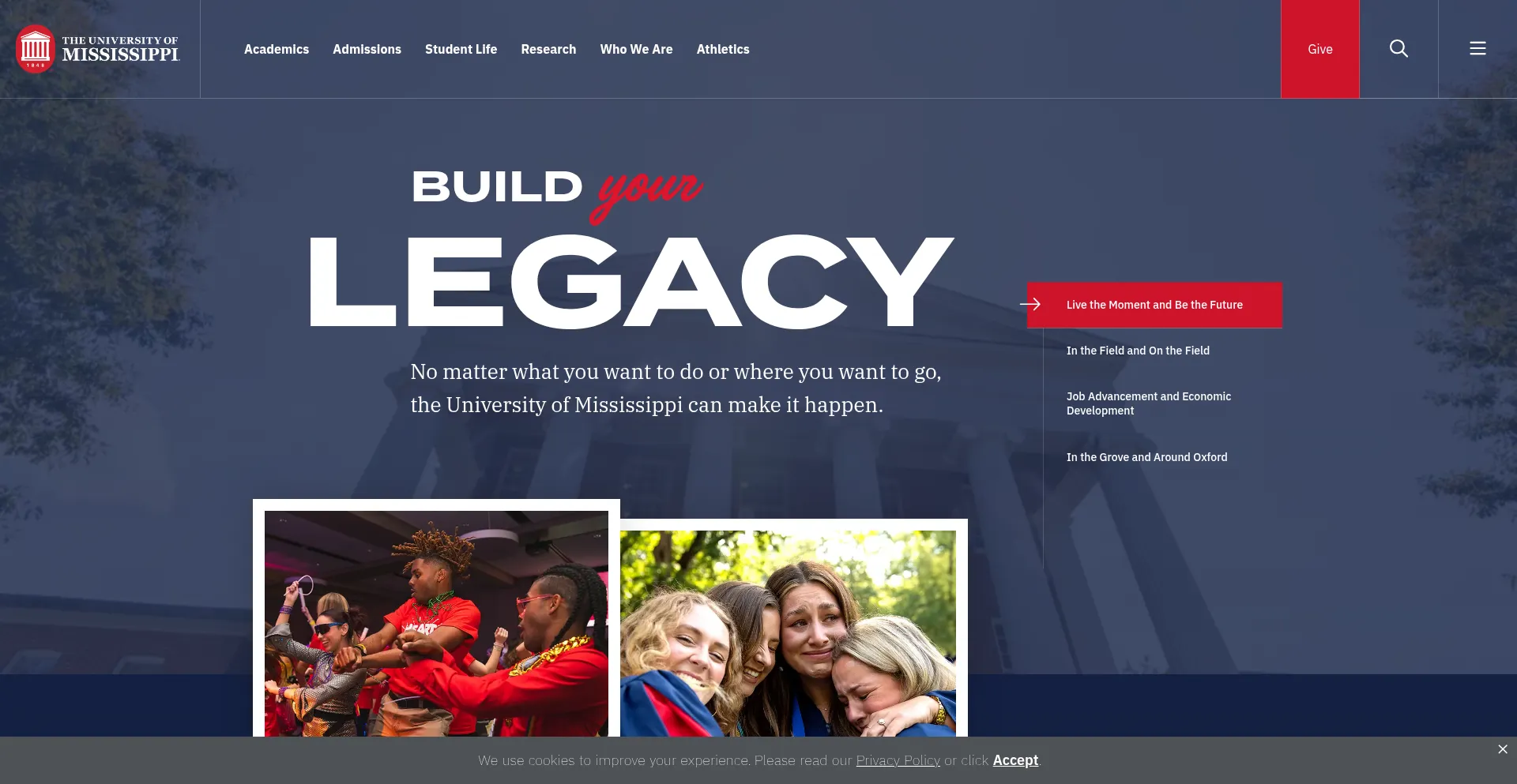 Build your legacy at Ole Miss. Explore our programs, research opportunities, and campus life at olemiss.edu.