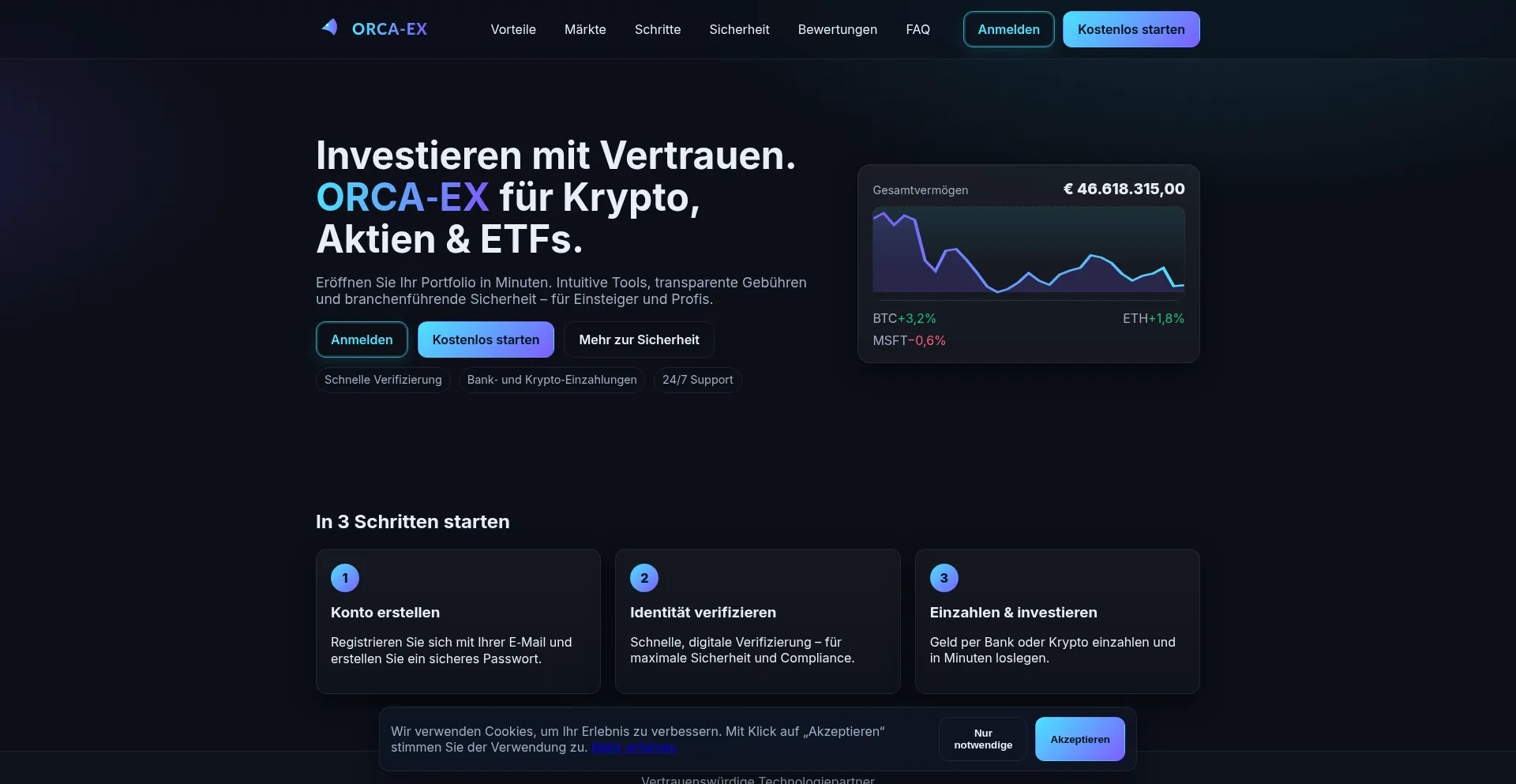 ORCA‑EX ist Ihre moderne Plattform für Krypto, Aktien und Investments. Sicher, schnell und intuitiv. Starten Sie noch heute mit Ihrem Portfolio.