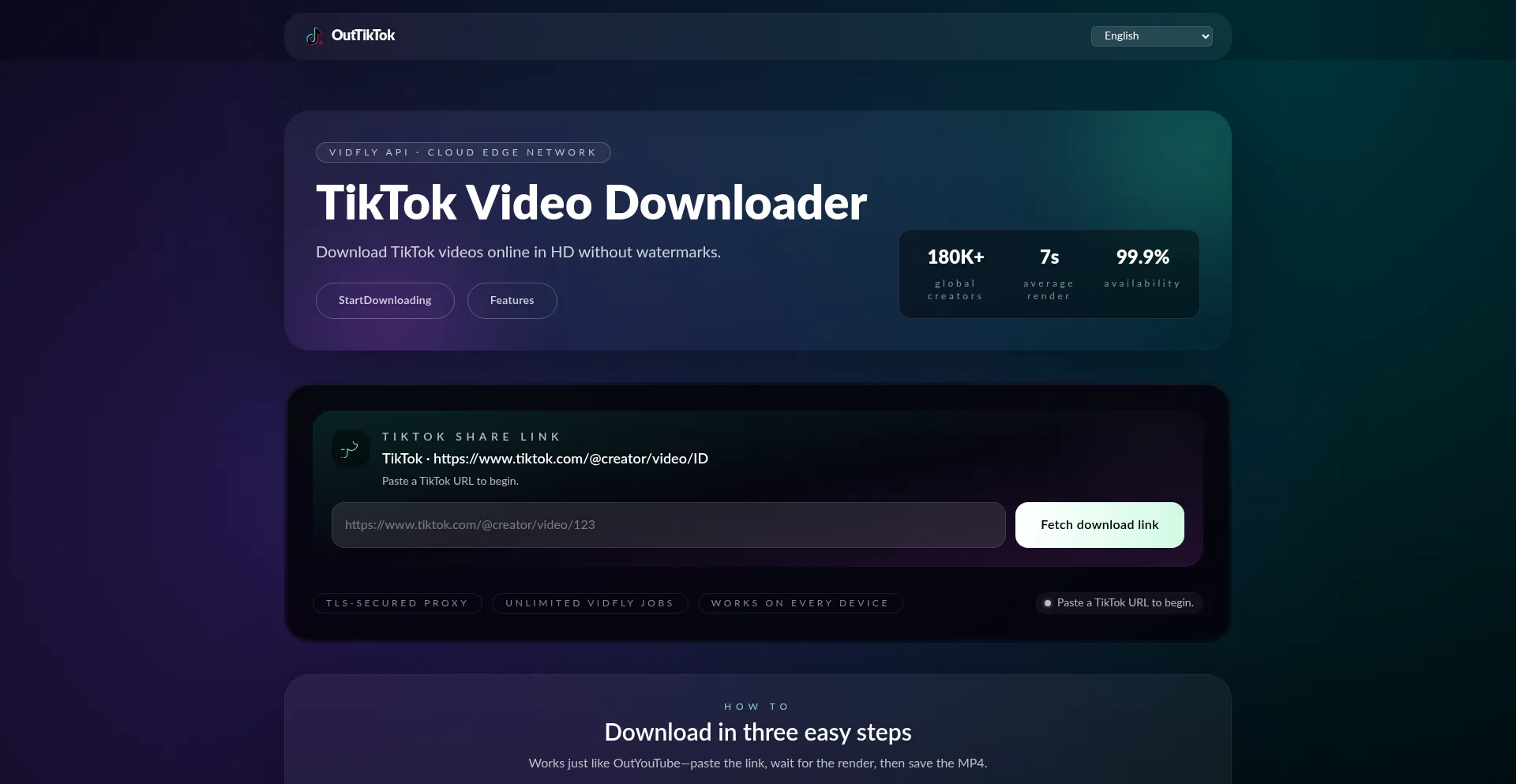 OutTikTok Video Downloader lets you save HD TikTok videos without watermarks using secure Vidfly APIs. Paste a link and download instantly on desktop or mobile.