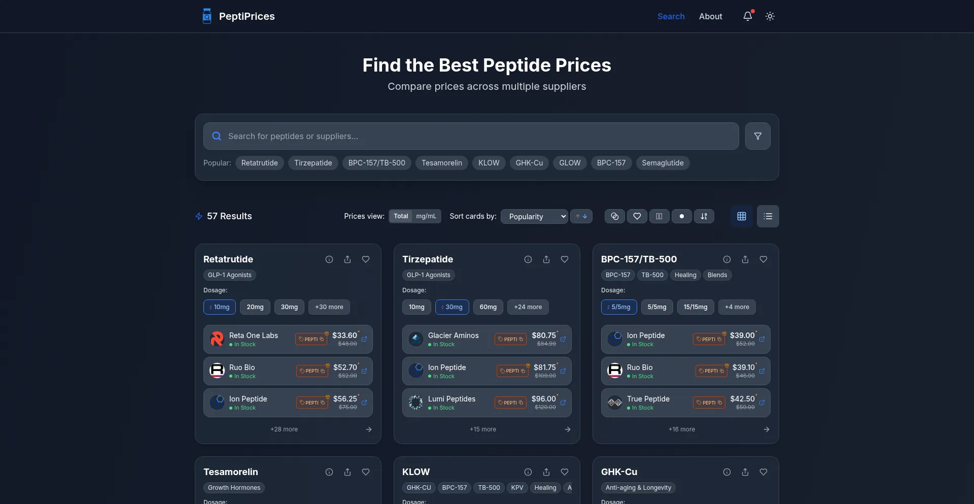 Find the best prices for research peptides including Retatrutide, Tirzepatide, BPC-157, and more. Compare prices across verified suppliers with real-time stock status and detail...